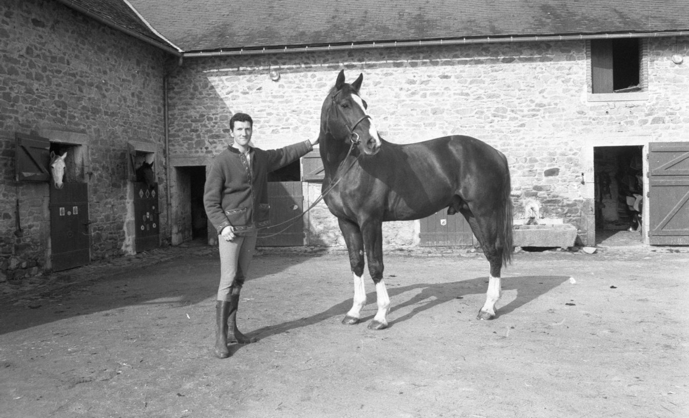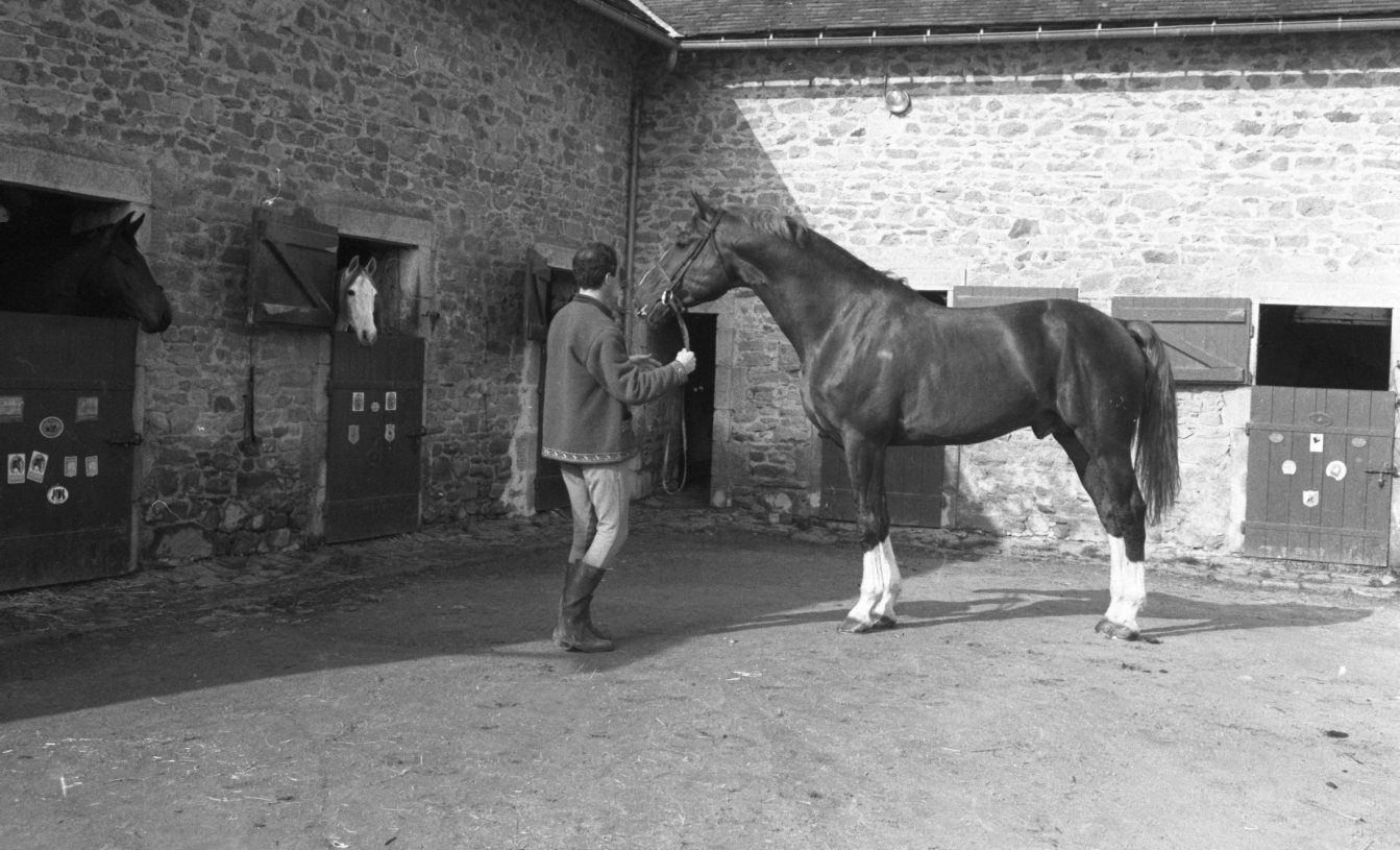 Dans le domaine du château, un cavalier s'occupe d'un cheval près des écuries du haras de Nexon, en Haute-Vienne, en mars 1991.