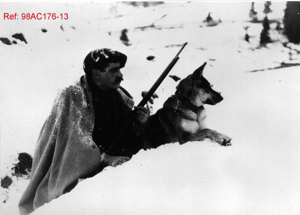 Homme armé d’un fusil, accompagné d’un chien, dissimulés dans la neige.