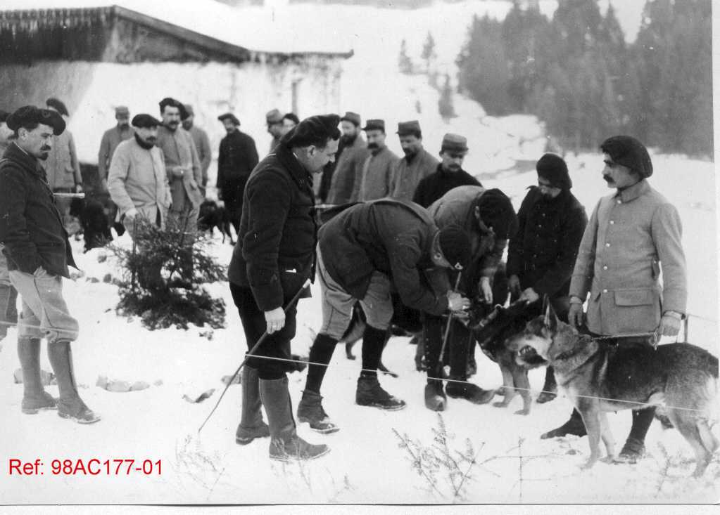 Hommes avec des bergers allemands dans la neige
