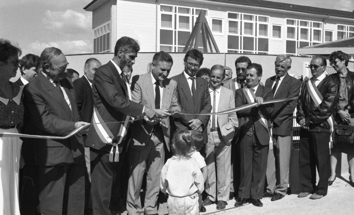 Des élus et d'autres officiels coupent le ruban d'inauguration du groupe scolaire Jean Peyraud, à Pierre-Buffière en Haute-Vienne, en septembre 1990.