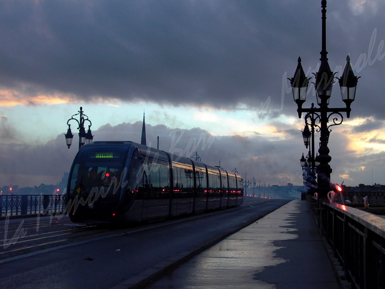 Inauguration du tramway de Bordeaux le dimanche 21 décembre 2003. Reportage de huit photos sur la première mise en circulation du tramway A. La ram traverse le pont de pierre pour la premère fois au milieu de la foule de spectateurs.