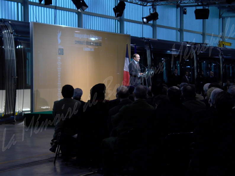 Inauguration du tramway de Bordeaux (ligne A) par le Président de la République Jacques Chirac et par le maire Alain Juppé, le dimanche 21 décembre 2003. Reportage de dix photos sur les différentes personnalités prononçant leur discours aux Ateliers du Tramway.