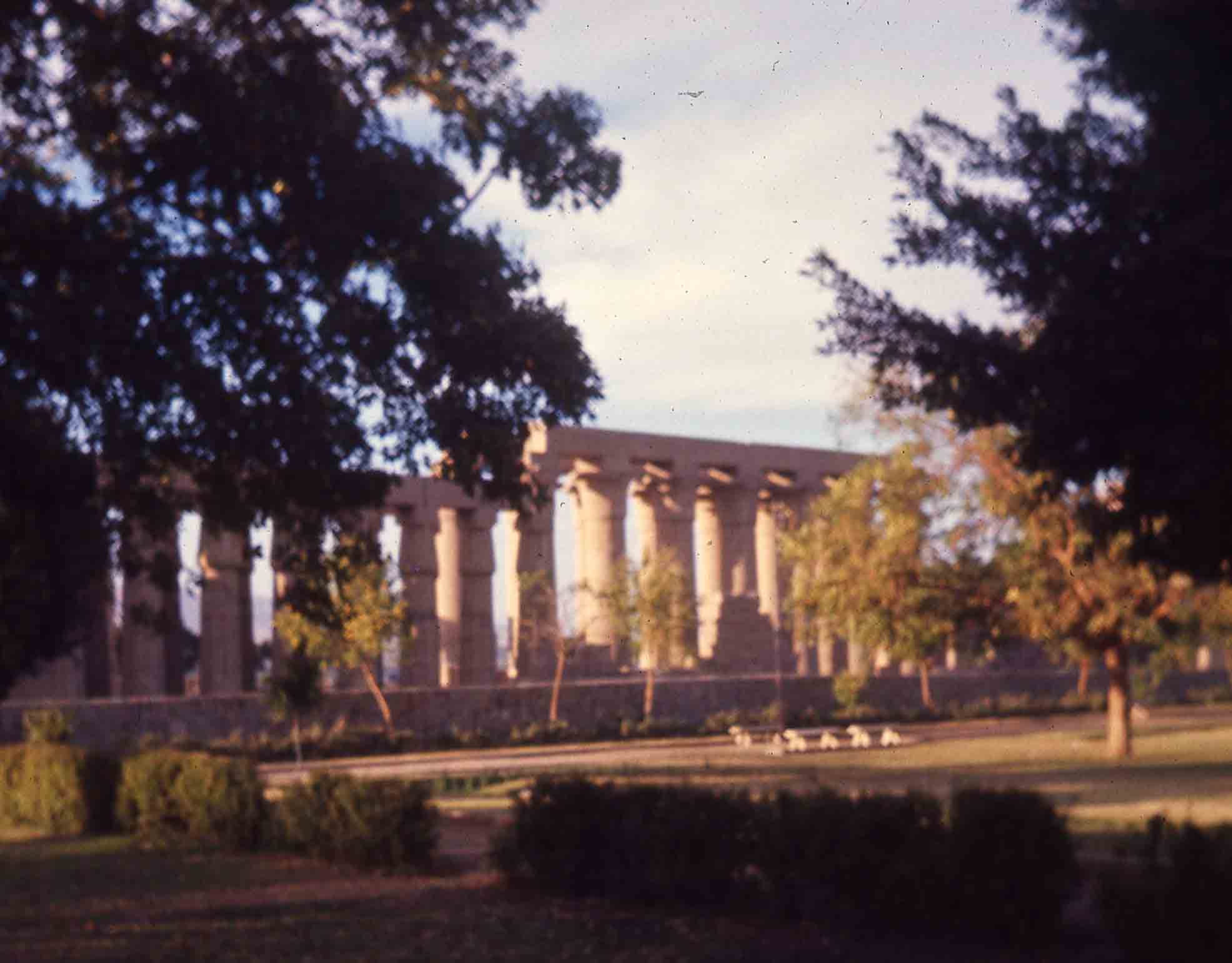 Photo prise dans un lieu inconnu en Égypte. On y voit une rangée de colonnes en arrière plan, des arbres au premier.