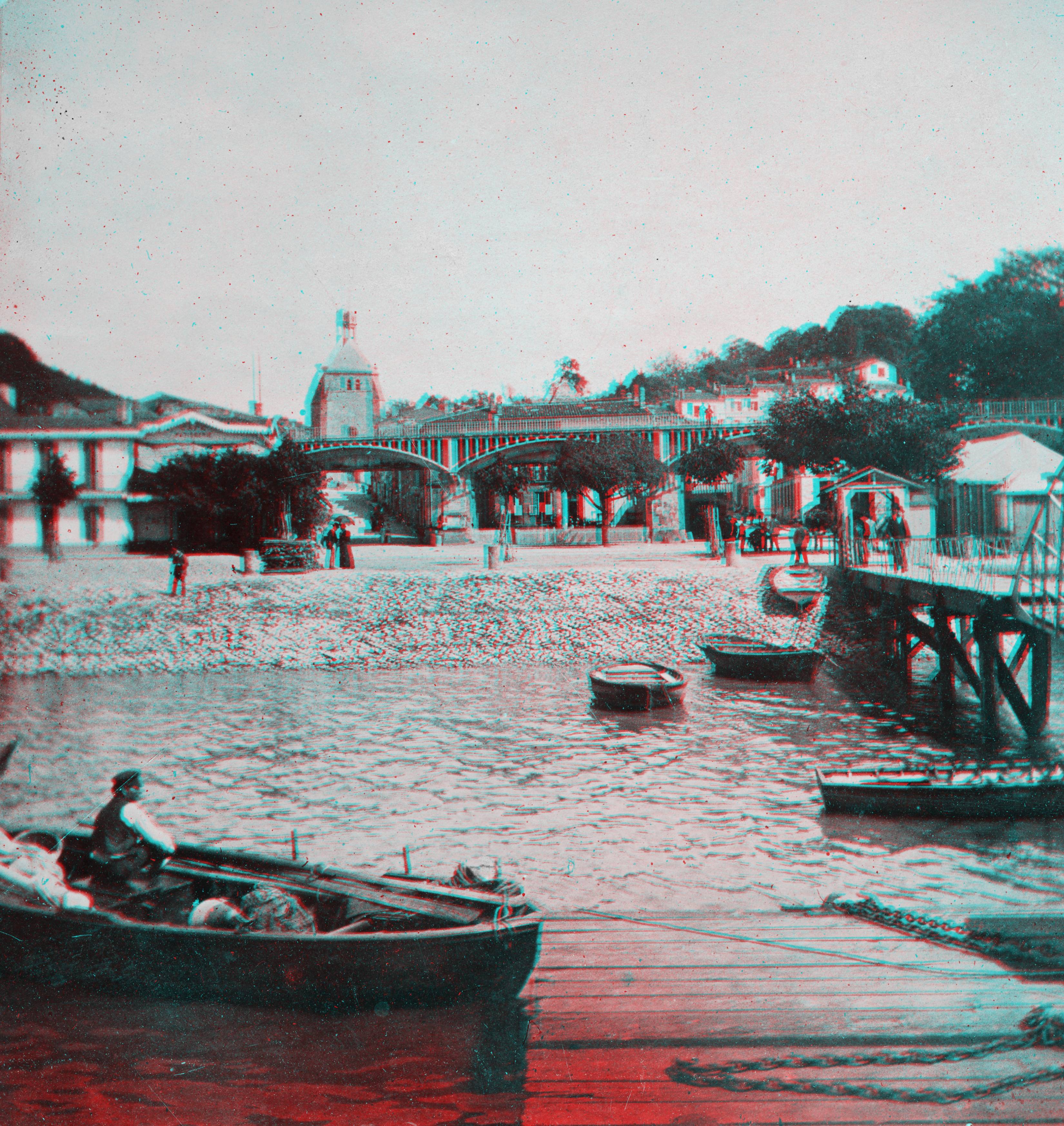 Vue de l'embarcadère de Lormont, que l'on aperçoit sur la droite, et qui débouchait directement sur le centre de la commune. Jusqu'au premier quart du XXe siècle au moins, toutes les communes des environs de Bordeaux donnant sur le fleuve possédaient de tels embarcadères, qui étaient desservis par de petits vapeurs (comme celui présenté sur la photo SAB114) qui faisaient la jonction entre tous ces petits ports, et ralliaient soit l'embarcadère des vapeurs Bordeaux-Océan devant la gare d'Orléans, soit Bacalan (en amont du Bassin à flot). Ils assuraient ainsi une desserte de passagers totalement disparue aujourd'hui avec le développement des transports automobiles et ferroviaires. Traversant la commune, on aperçoit un pont métallique qui portait la route de Bordeaux à Bassens. L'embarcadère comportait une passerelle avançant sur la rive en pente du fleuve, avec un côté en plan incliné, que l'on voit au premier plan, et qui permettait de décharger des marchandises quel que soit le niveau de la marée (sensible en Garonne au-delà de Bordeaux). La configuration du site a été aujourd'hui fortement bouleversée par la construction du pont d'Aquitaine (qui prend appui à peine plus en aval) et l'élargissement de la route de Bordeaux à Bassens et au Bec d'Ambes.