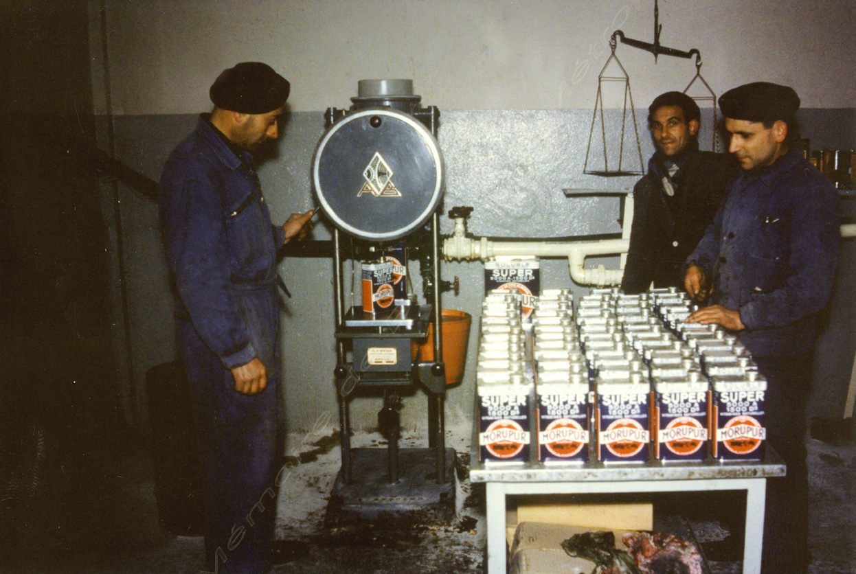 Reportage sur l'huilerie Morupur ( huile de foie de morue) à Bacalan : la voiture publicitaire, ouvriers à la mise en bidon, et les citernes d'huile.