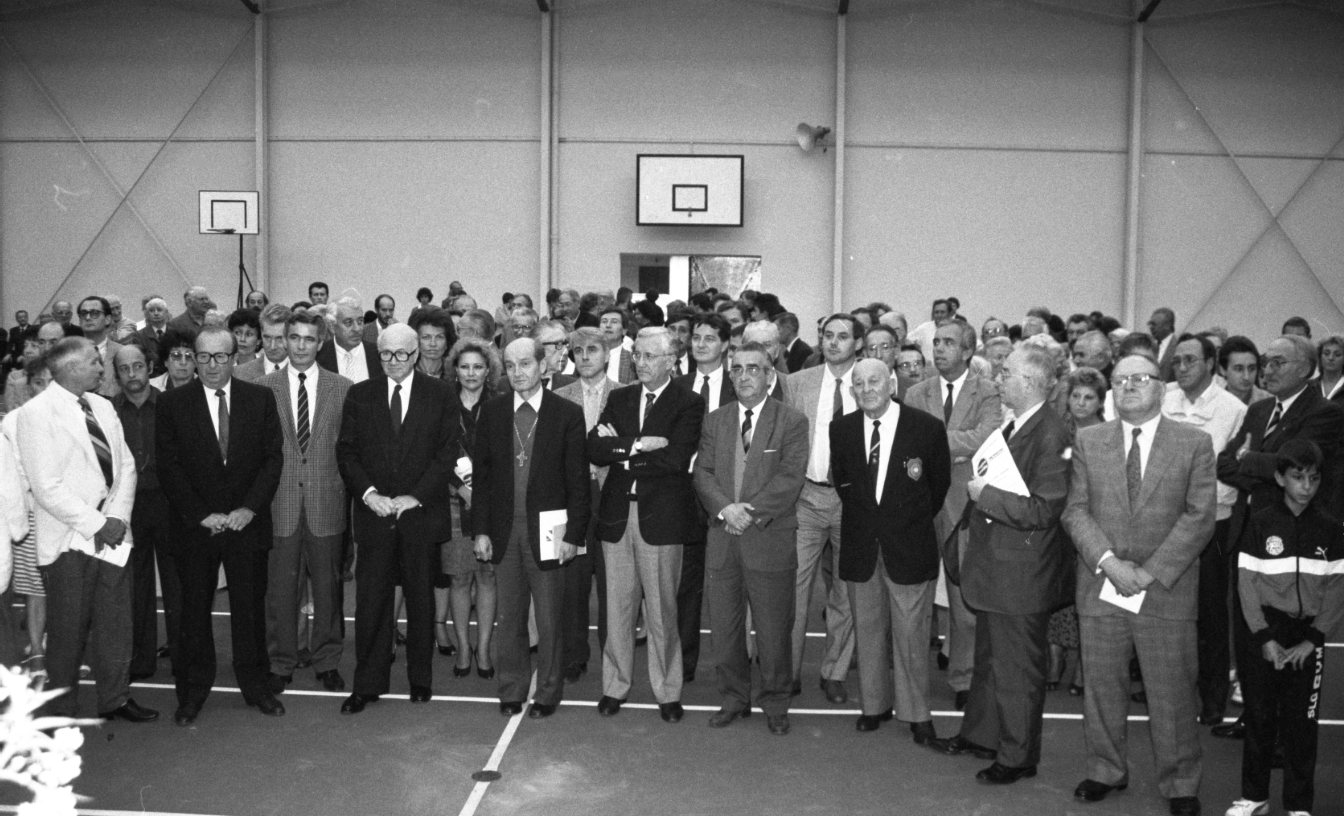 Louis Longequeue, maire de Limoges, des officiels et des membres de la Saint-Louis-de-Gonzague lors de l'inauguration du gymase du club sportif à Limoges, en 1988.