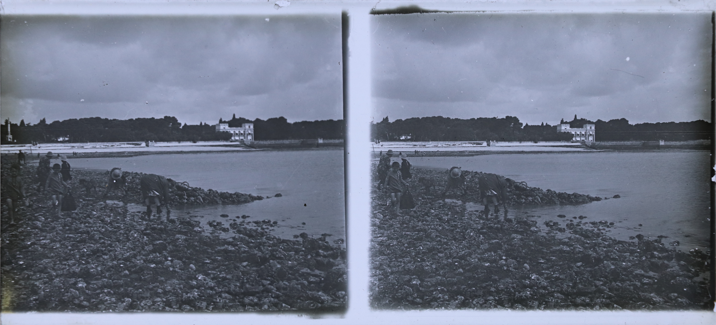 Profitant de la marée basse, des femmes et des enfants ramassent des coquillages sur le front de mer à la Rochelle, en Charente-Maritime, dans la première moitié du XXème siècle.