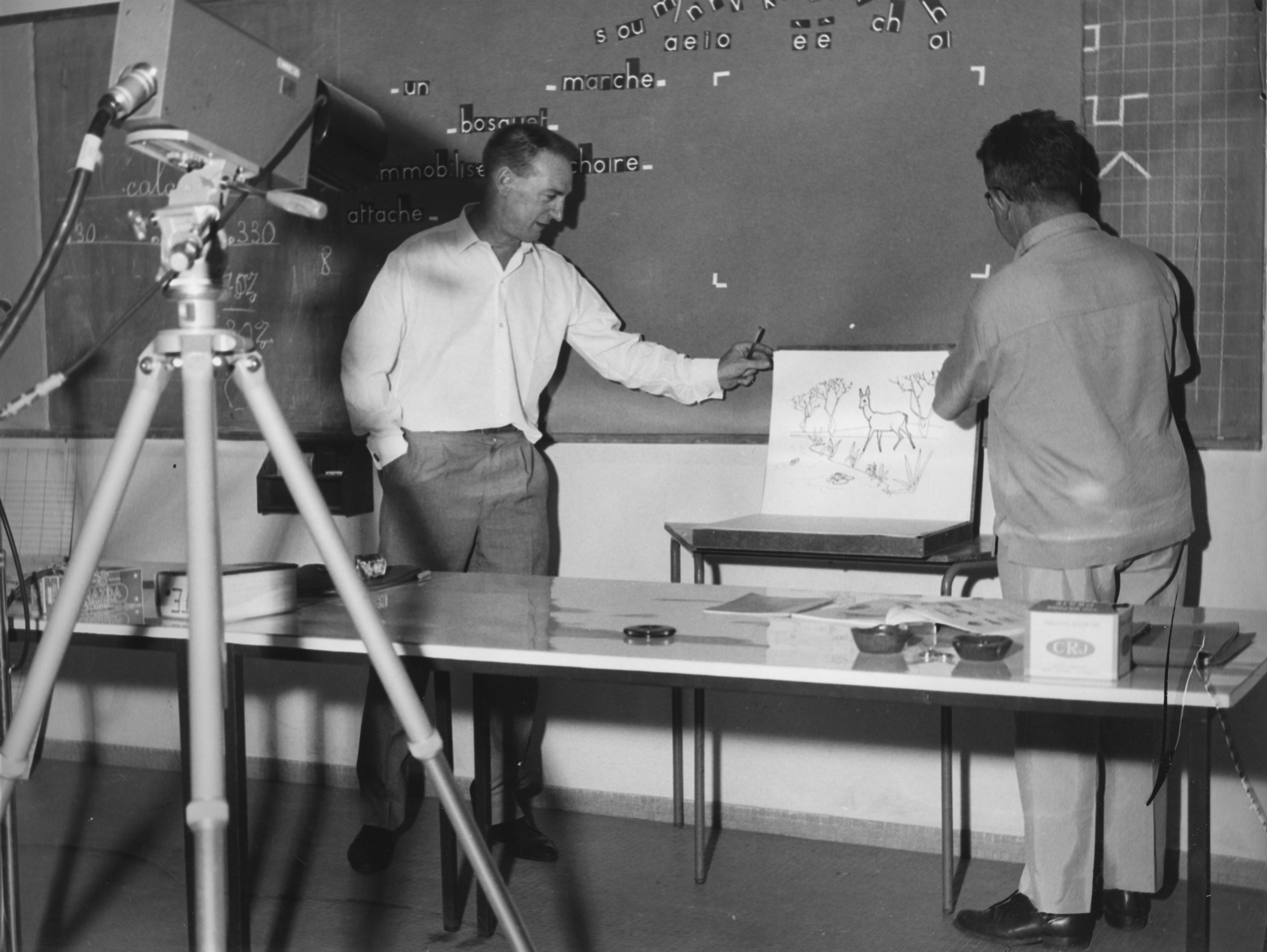 Lors d'un tournage d'une émission éducative télévisée, en Côte d'Ivoire, dans les années 1960.