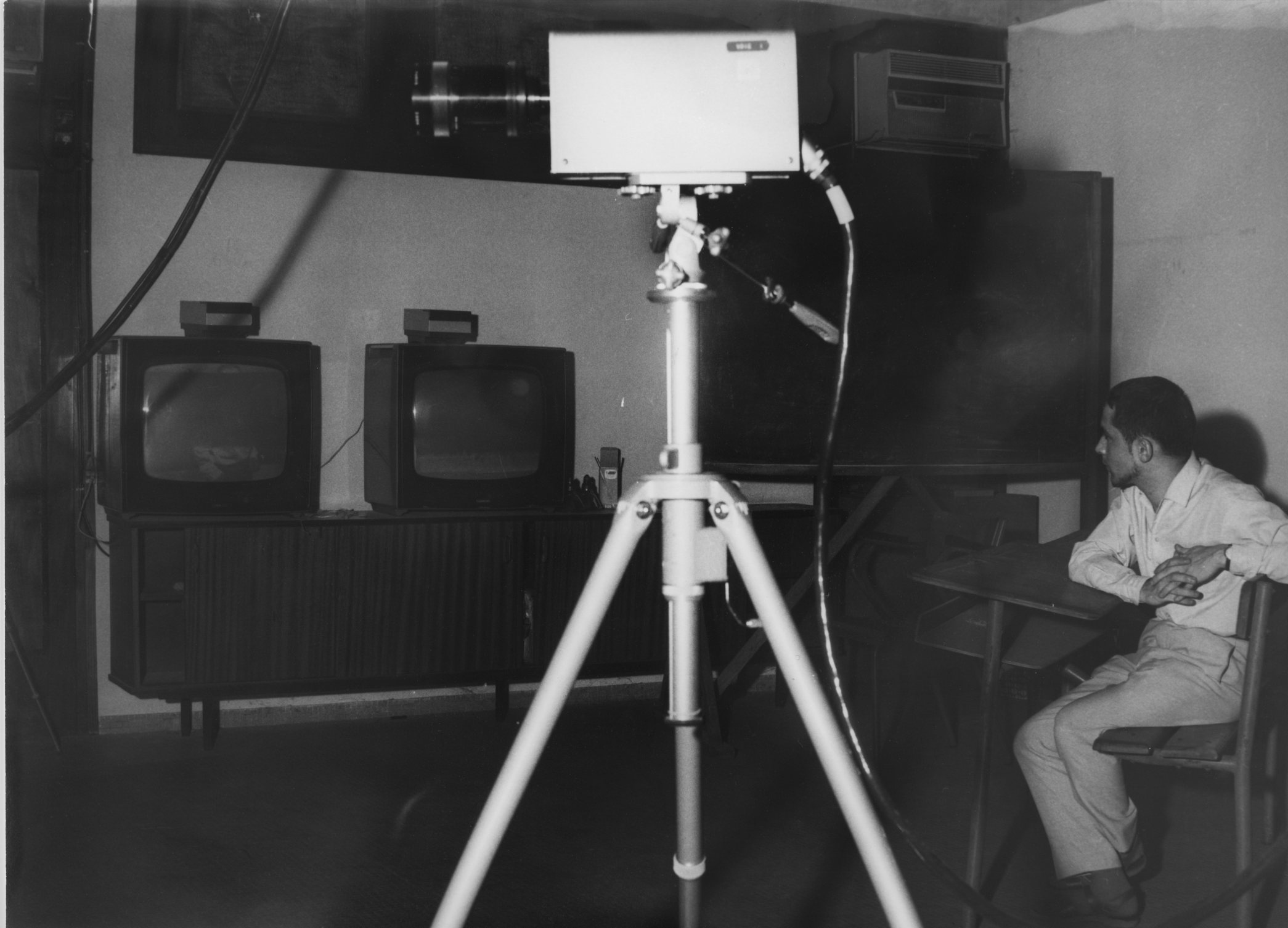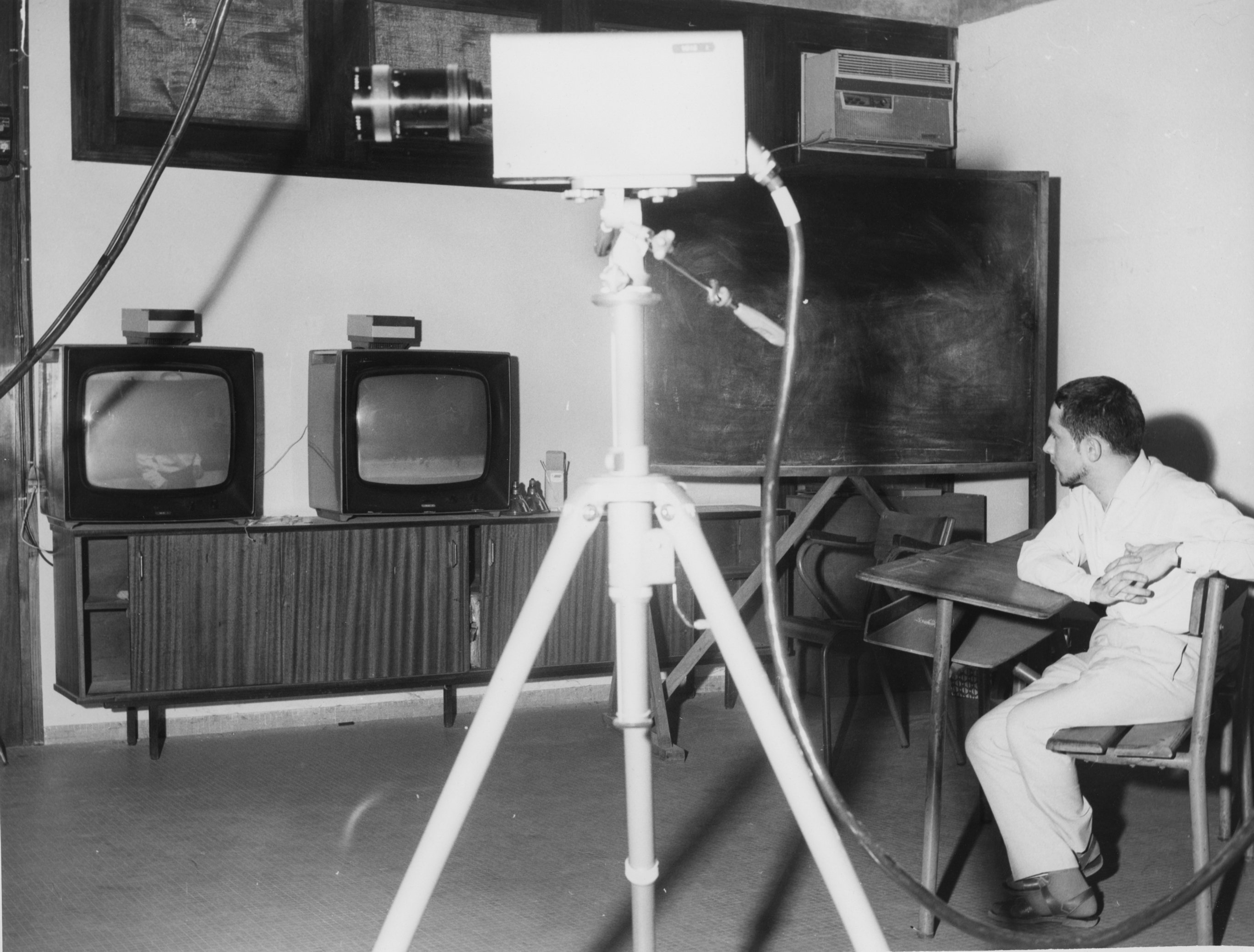 Le tournage d'une émission éducative télévisée, en Côte d'Ivoire, dans les années 1960.