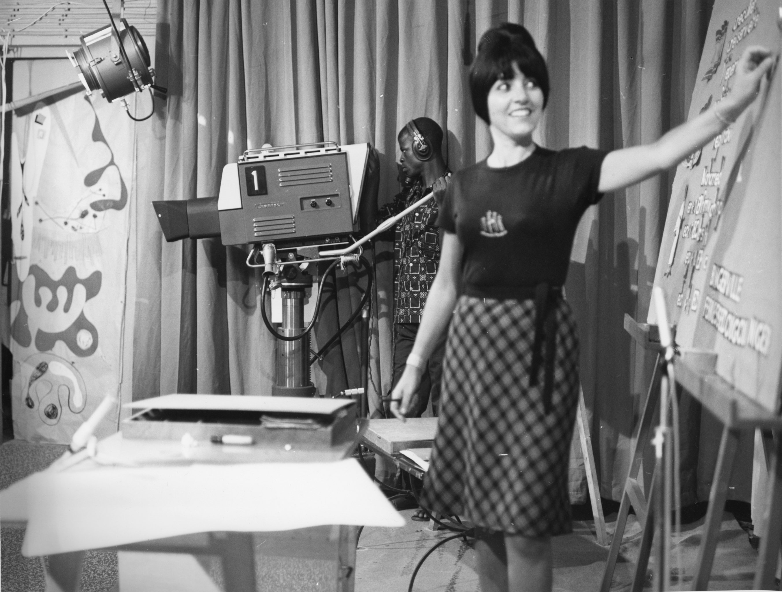 Lors d'un tournage d'une émission éducative télévisée, en Côte d'Ivoire, dans les années 1960.
