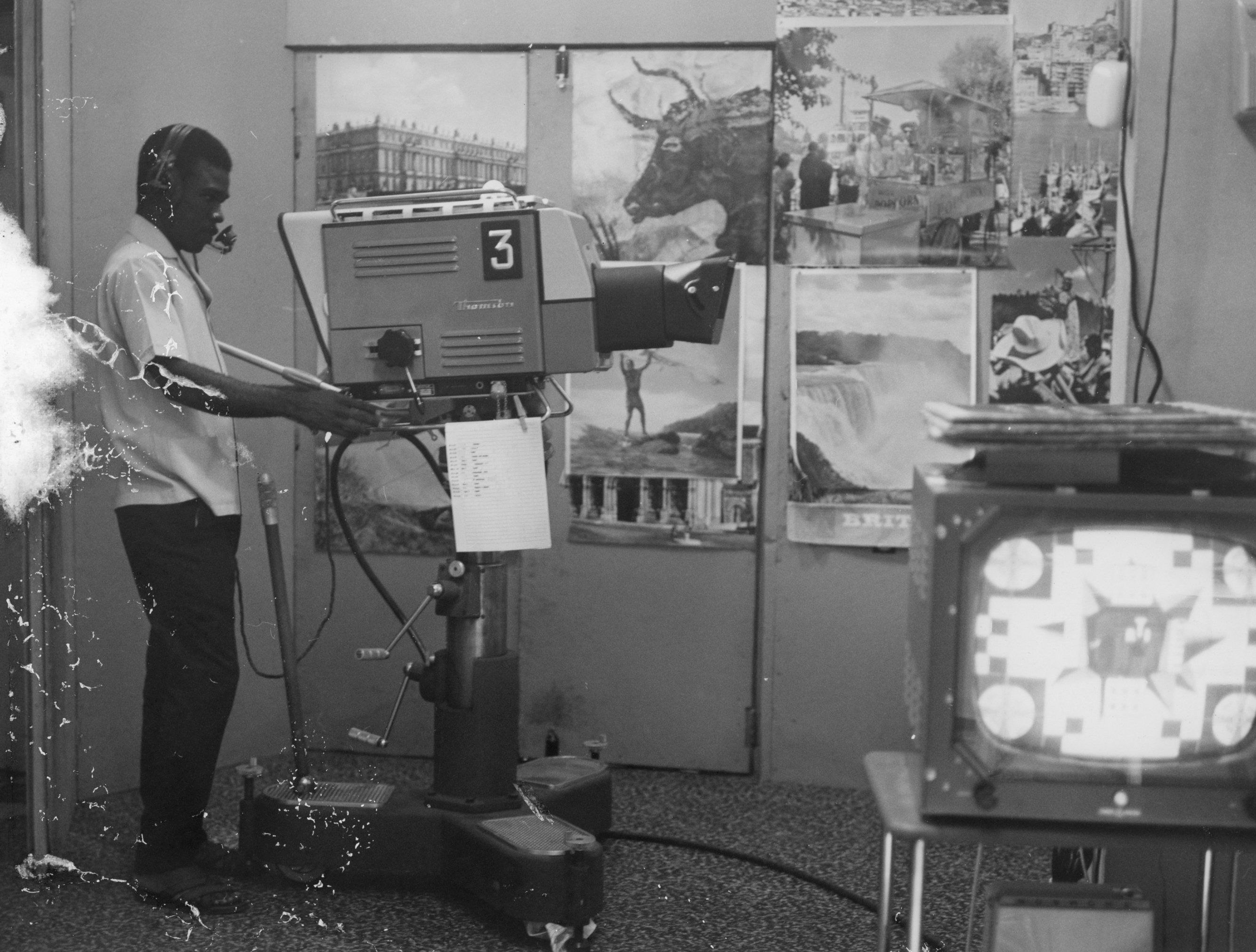 Un des caméramans de l'équipe de tournage d'une émission éducative télévisée, en Côte d'Ivoire, dans les années 1960.