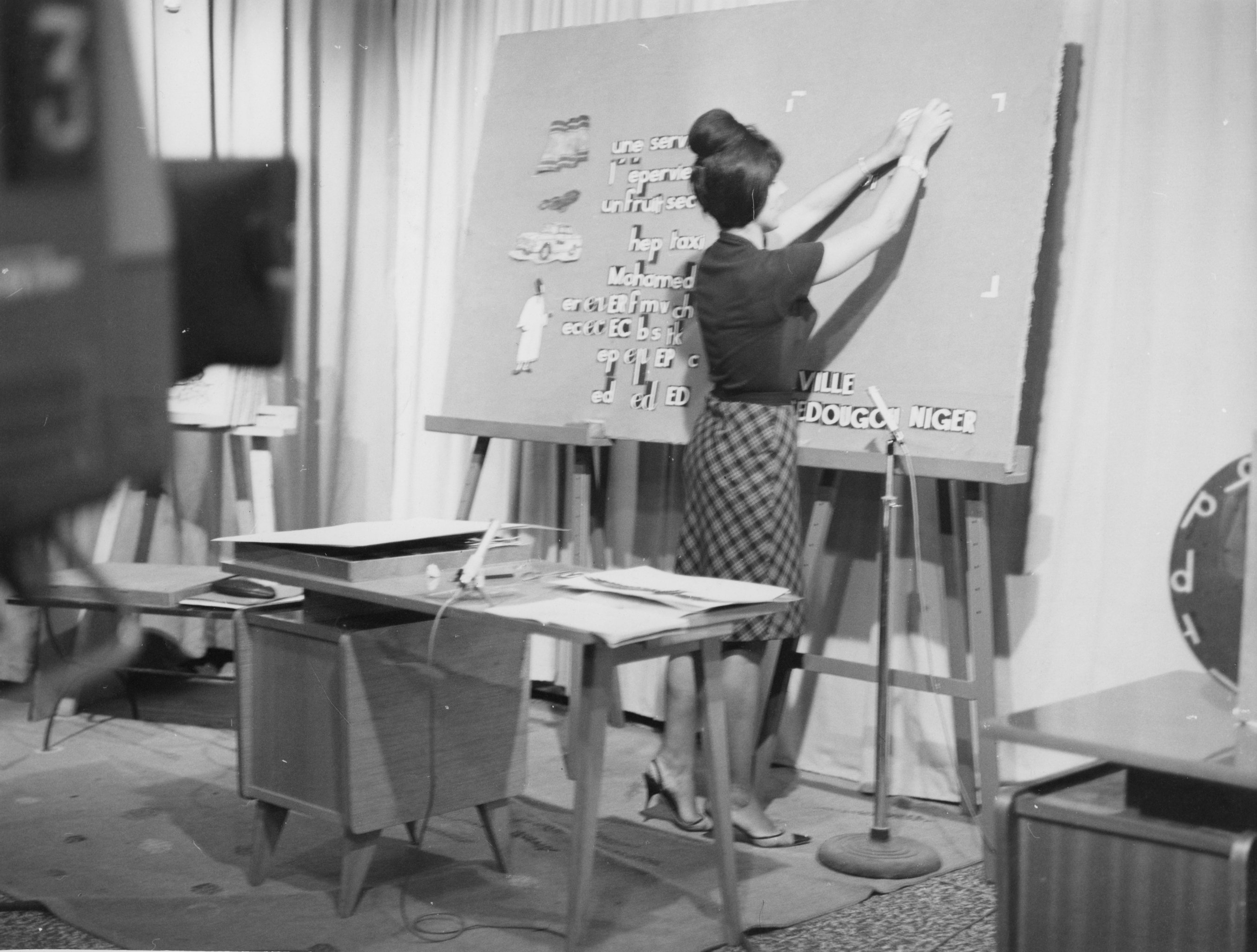 Lors d'un tournage d'une émission éducation télévisée, une des professeurs installe son matériel sur un tableau noir, en Côte d'Ivoire, dans les années 1960.