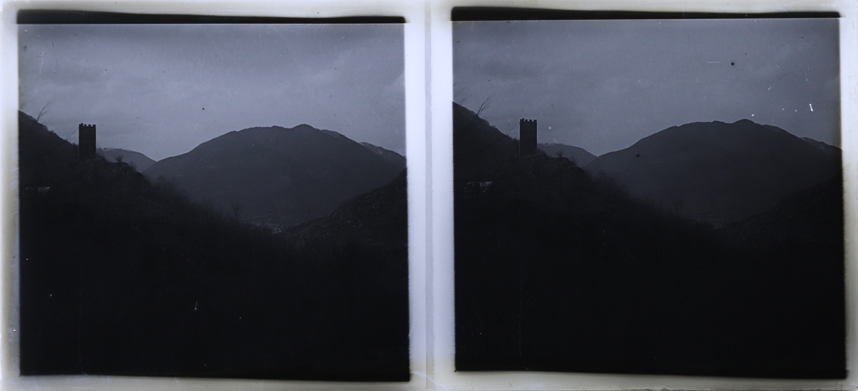 Au milieu des montagnes héraultaises, la Tour carrée, vestige du château médiéval de Caroz, dans le village de Colombières-sur-Orb, au cours des années 1920.