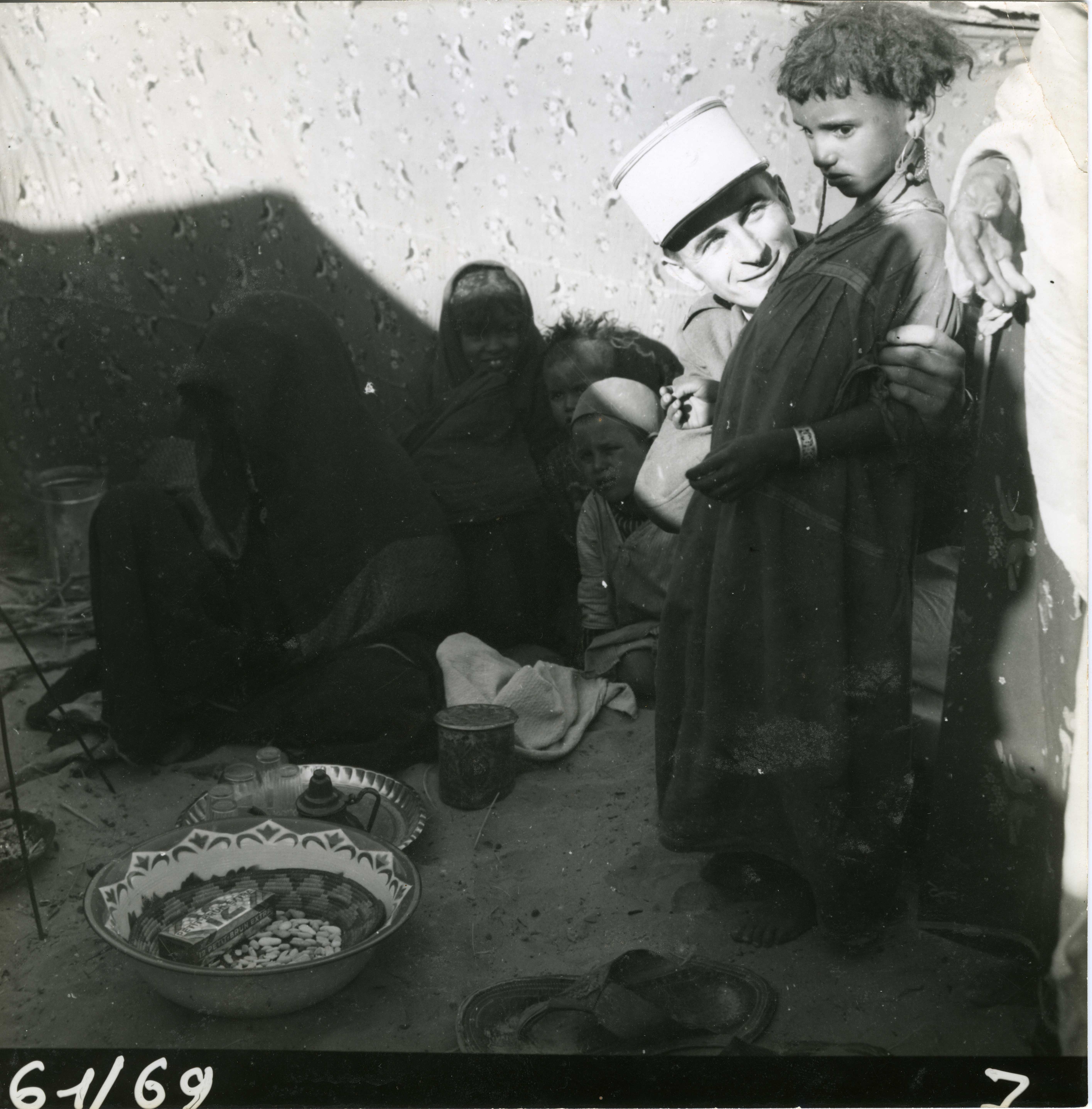 Un légionnaire tient par la taille une petite fille. En arrière plan, des enfants assis regardent le photographe en Tunisie ou en Algérie.