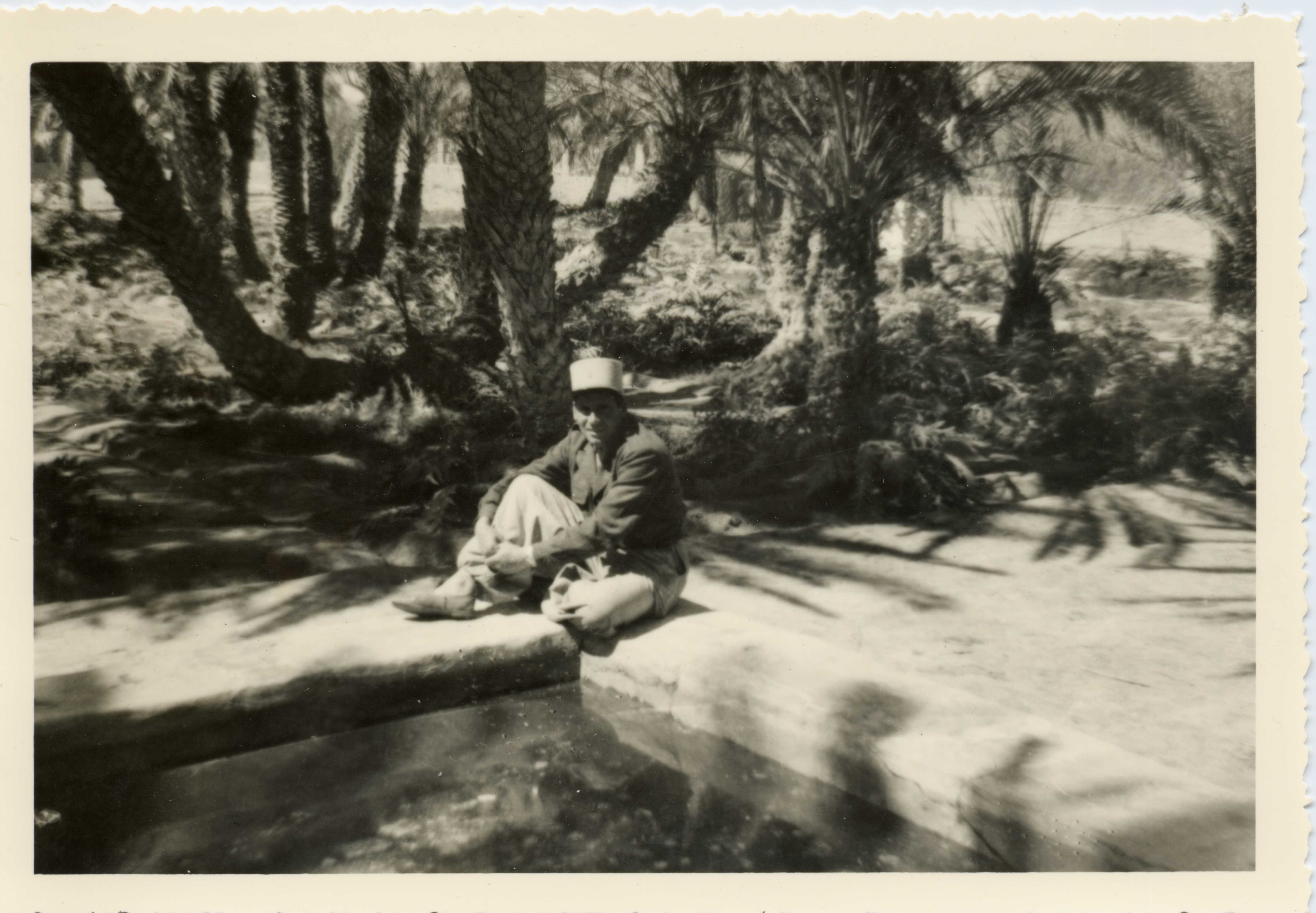Légionnaire posant près d'un bassin dans la forteresse de Remada.