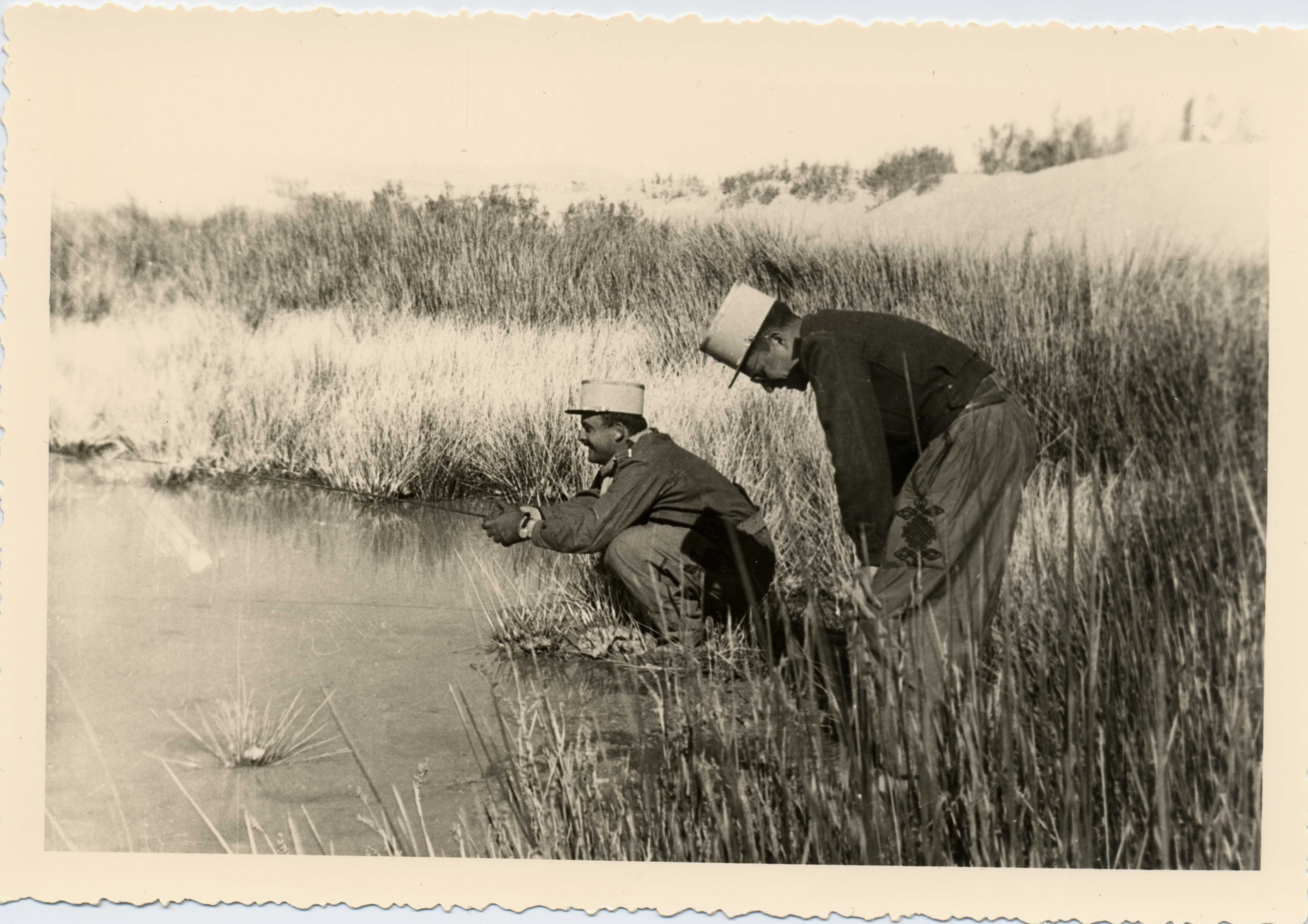 Légionnaires pêchant sur un plan d'eau.