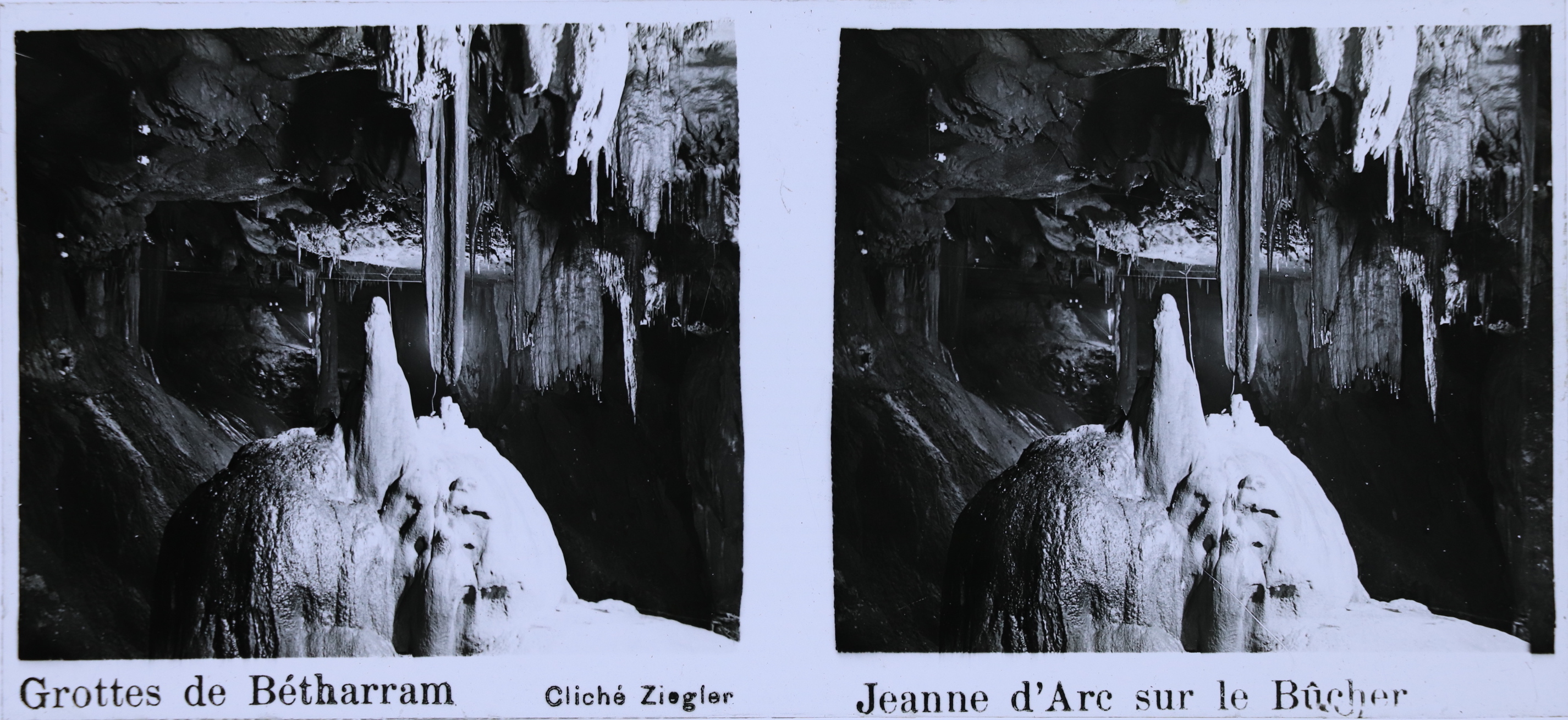 Le rocher nommé "Jeanne d'Arc sur le Bûcher" dans les grottes de Bétharram, à Saint-Pé-de-Bigorre, au début du XXème siècle.