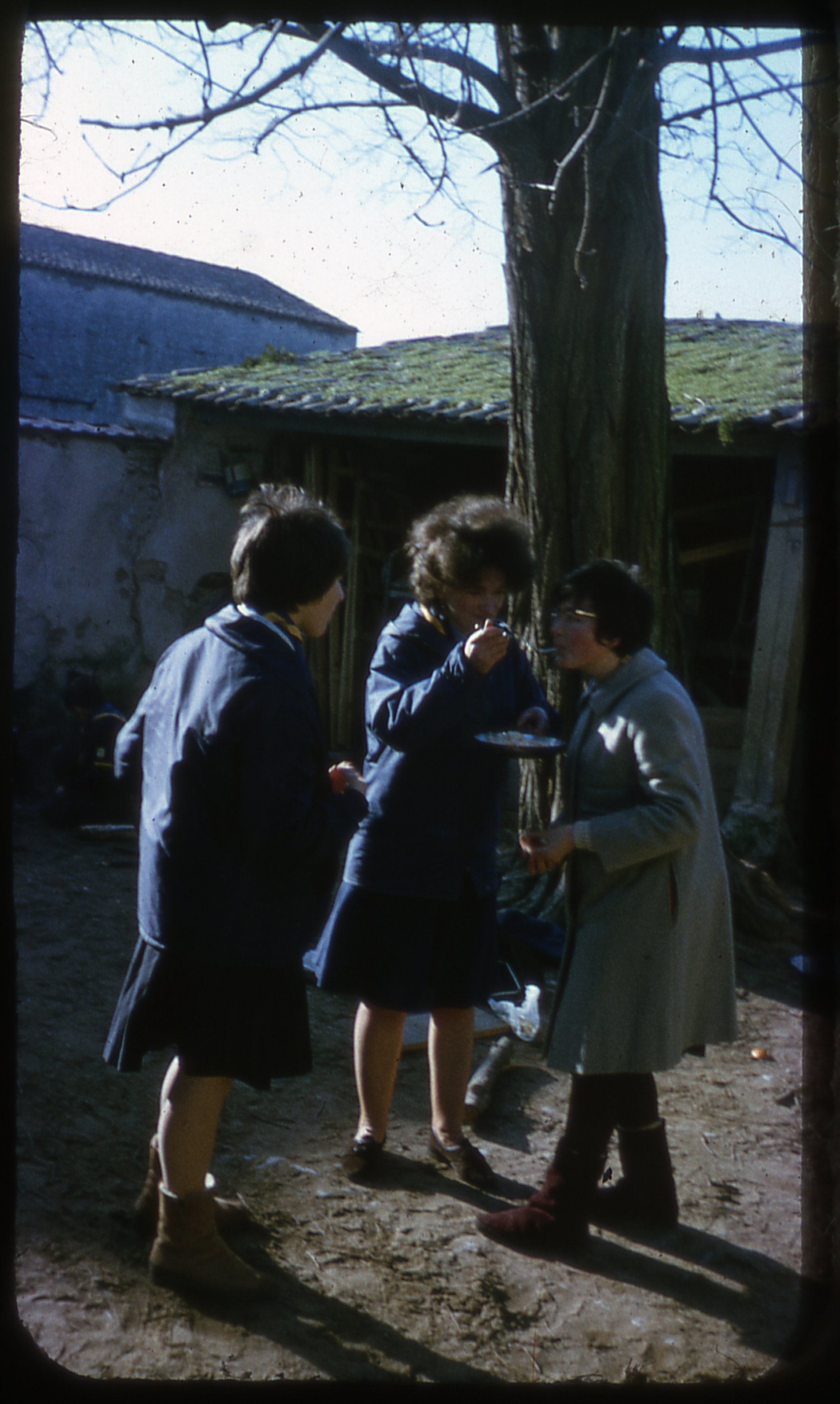 Les Louveteaux mangent dans une cour d'école sur l'Île d'Oléron dans les années 1970