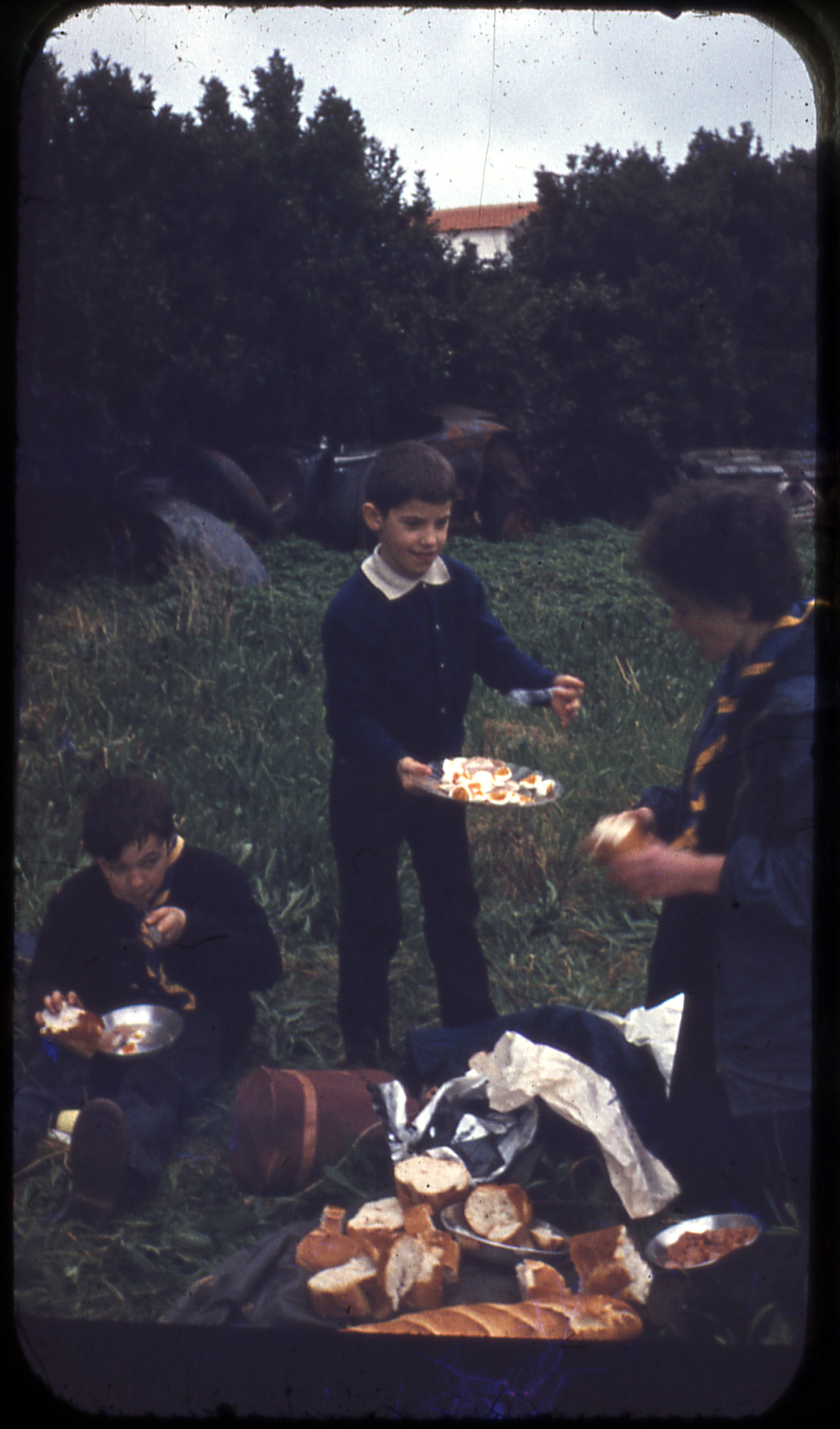 Les Louveteaux pique-niquent sur l'Île d'Oléron dans les années 1970. Un scout propose à manger à ses camarades.
