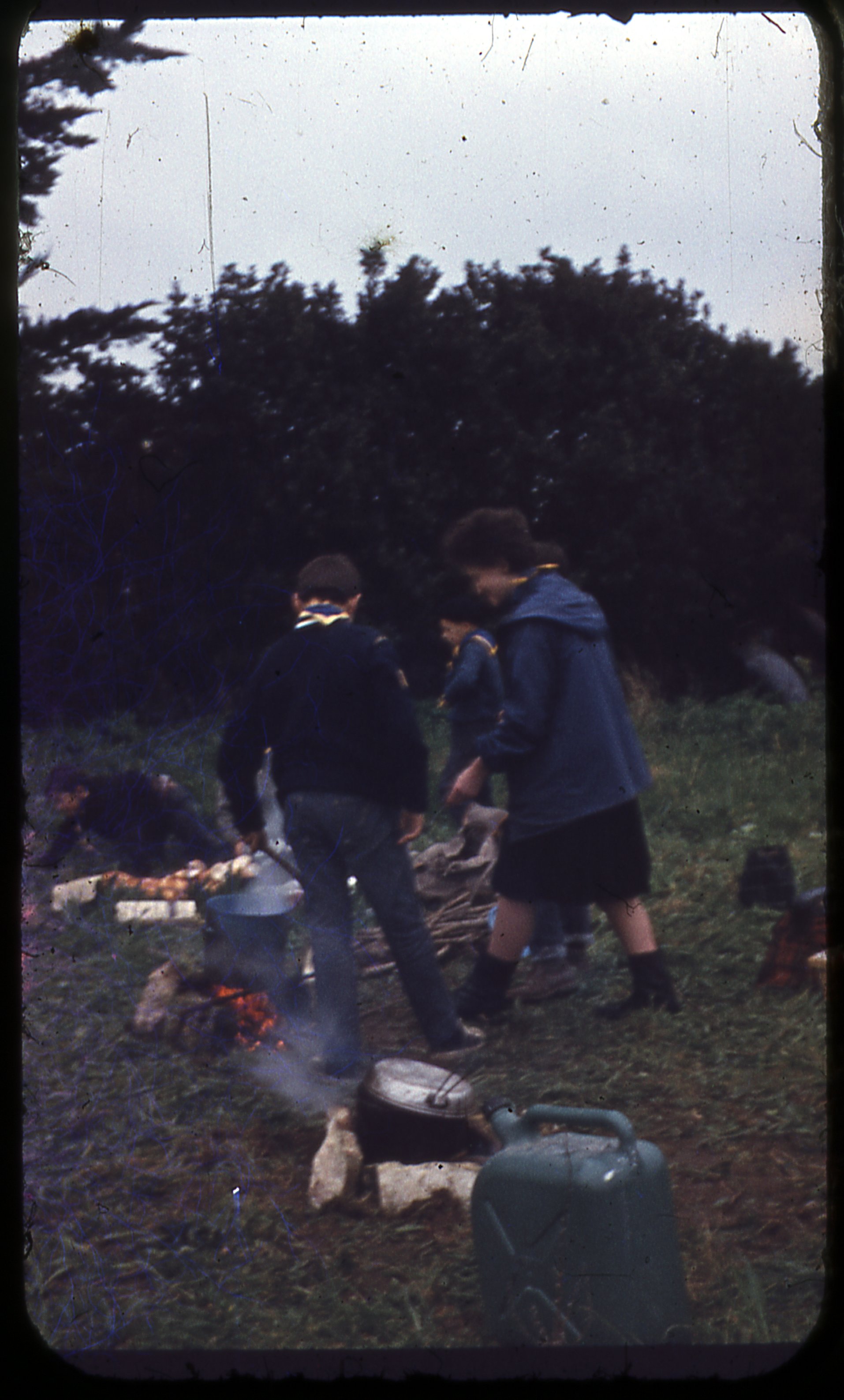 Les Louveteaux pique-niquent et font un feu sur l'Île d'Oléron dans les années 1970.