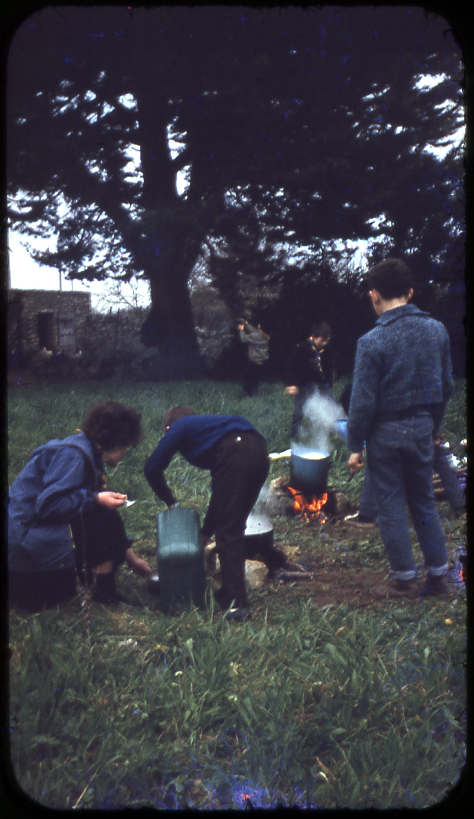 Les Louveteaux préparent à manger autour d'un feu sur l'Île d'Oléron dans les années 1970.