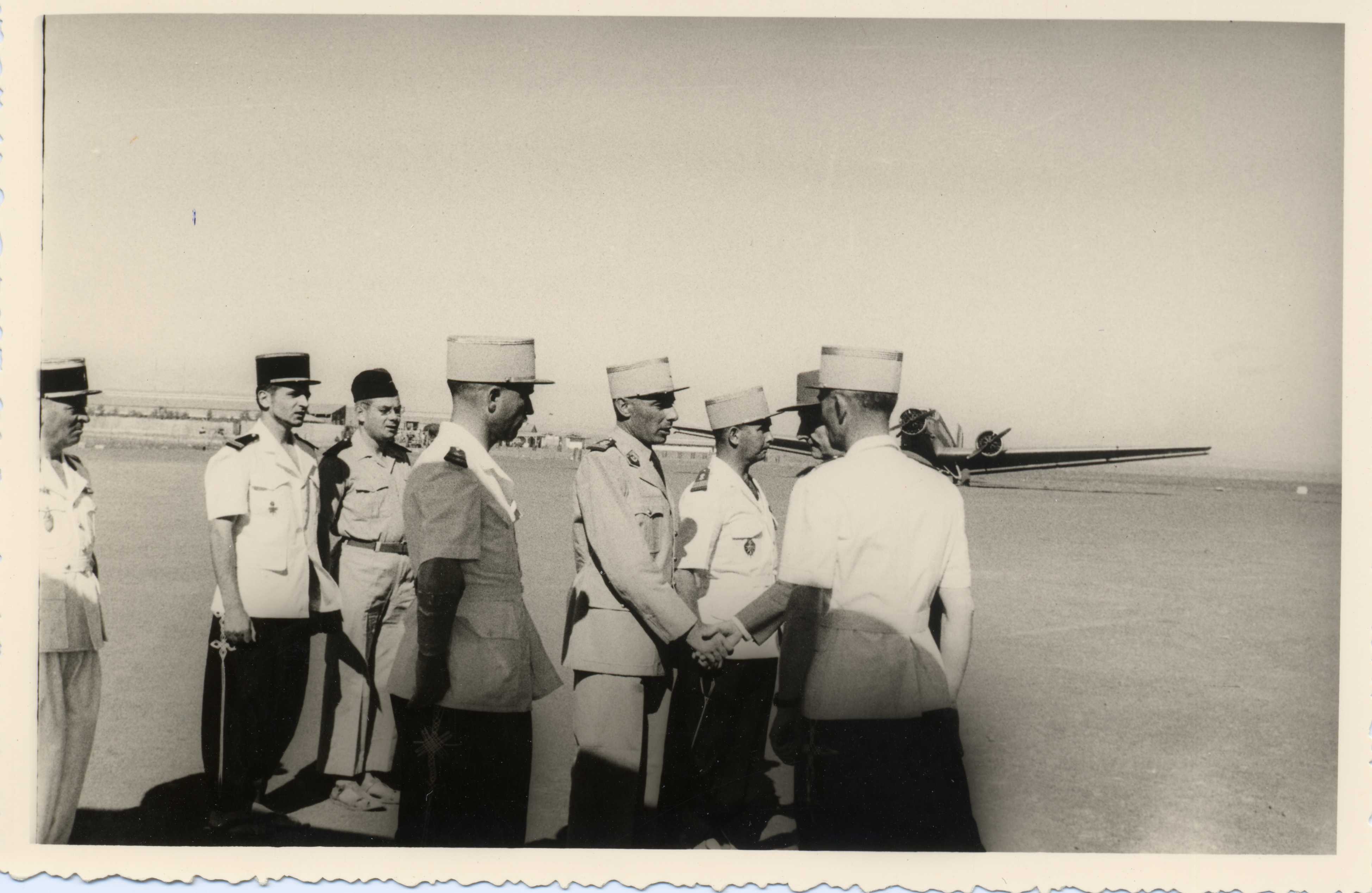 Malraux salue des militaires sur l'aéroport dans les années 1950