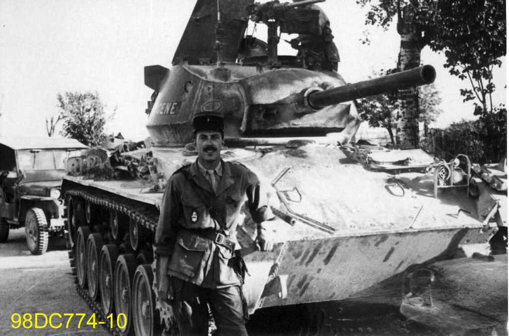 Militaire devant un char léger AMX-13.