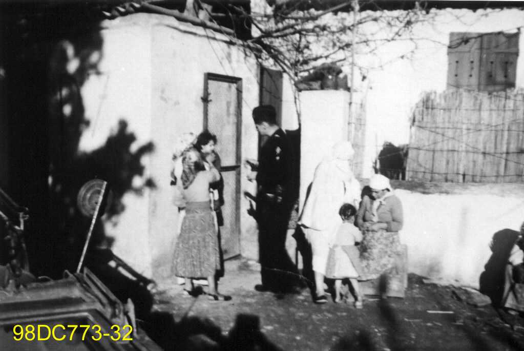 Militaire français avec des femmes et des enfants algériens devant une maison