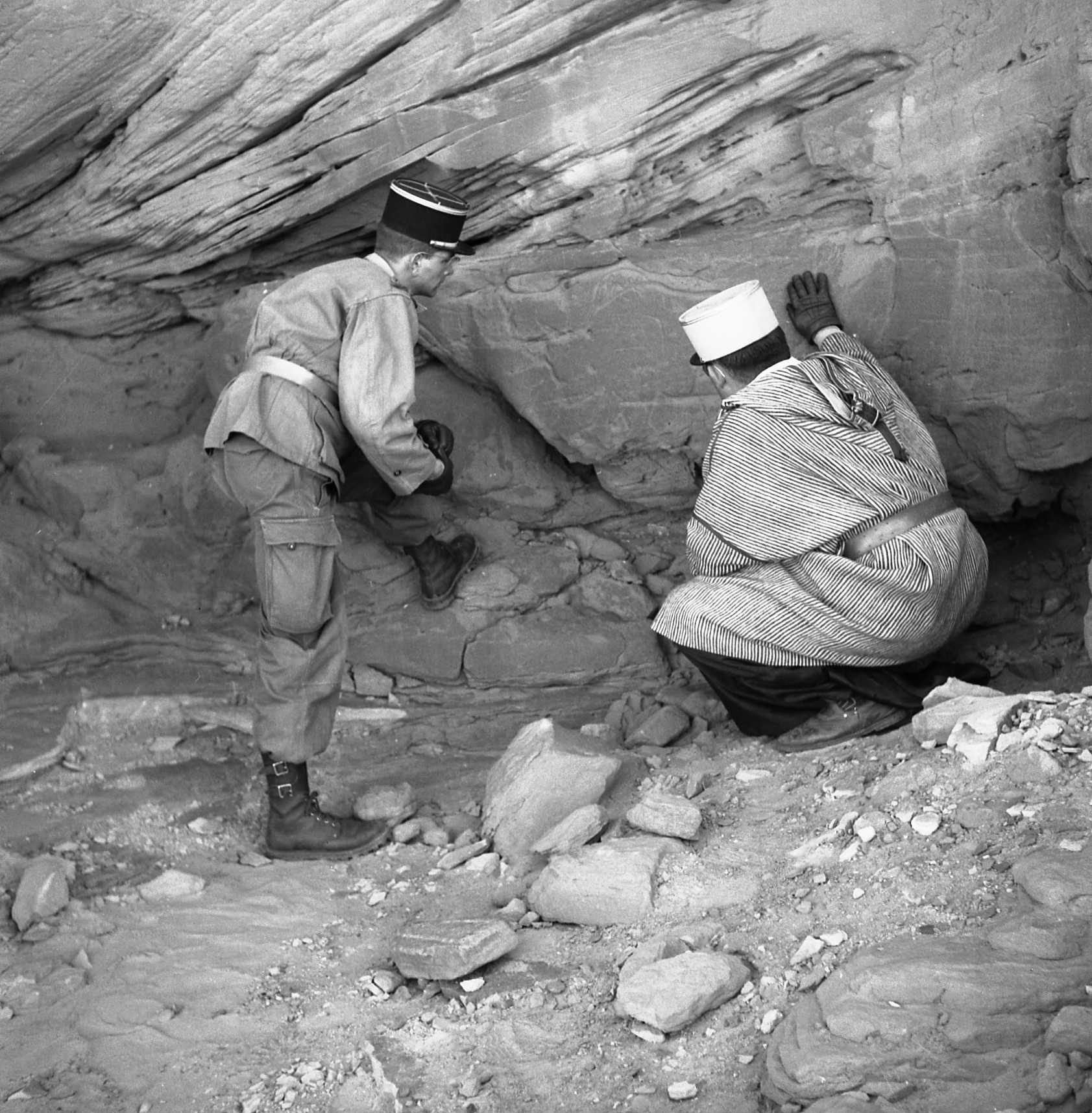 Militaires explorant une cavité ou une grotte. La photo a certainement été prise dans le désert.