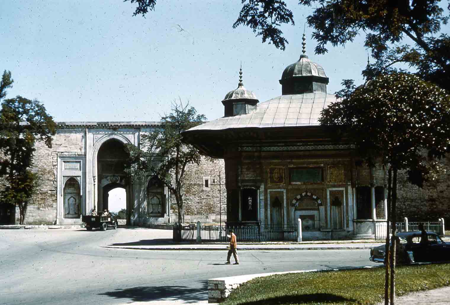 Photo d'un lieu inconnu dans la ville d'Istanbul. Un monument en face, une porte à côté, un passant qui traverse.