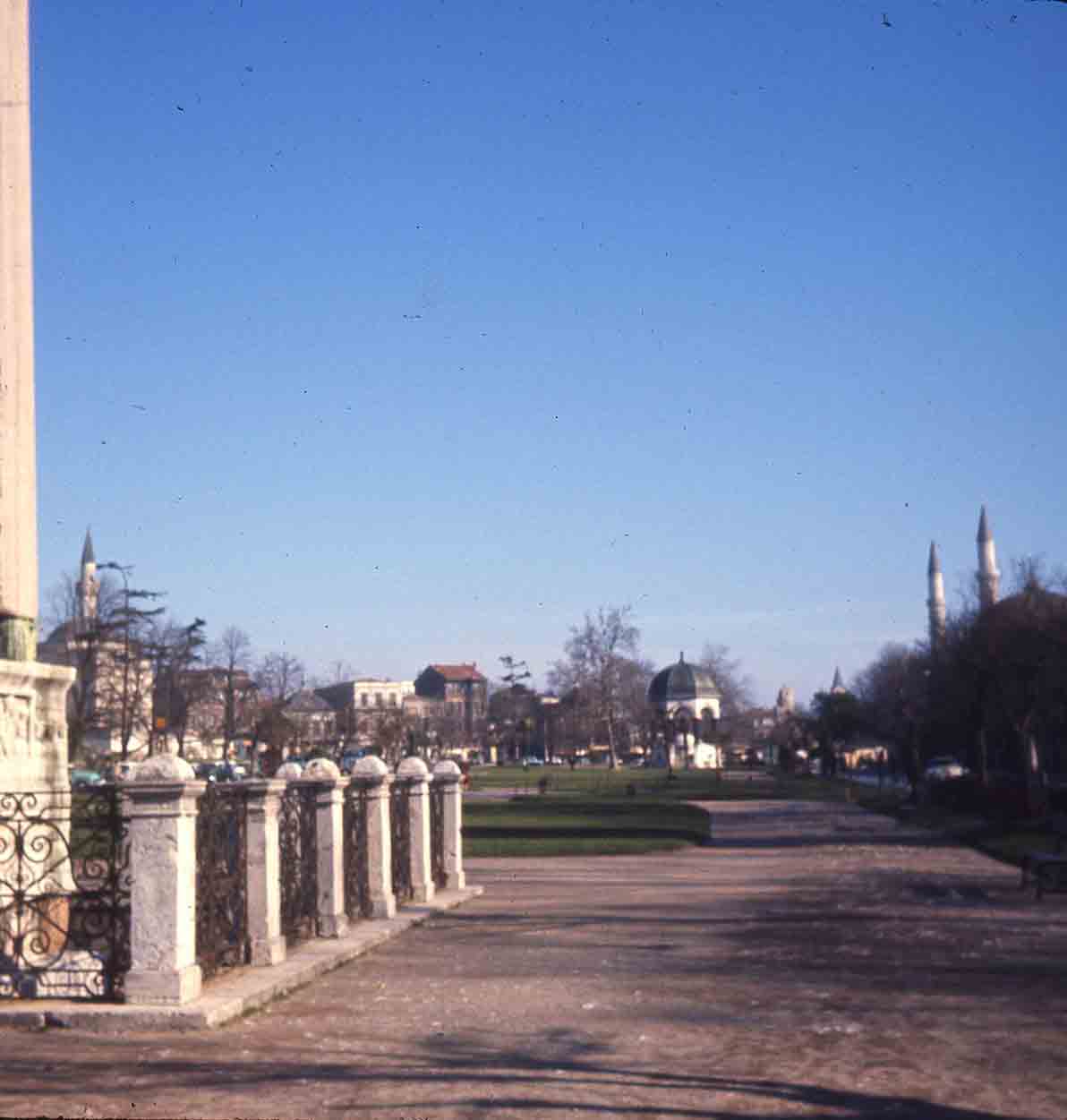 Prise de vue sur un chemin menant à la Mosquée Bleue d'Istanbul avec l'Obélisque de Théodose sur la gauche.