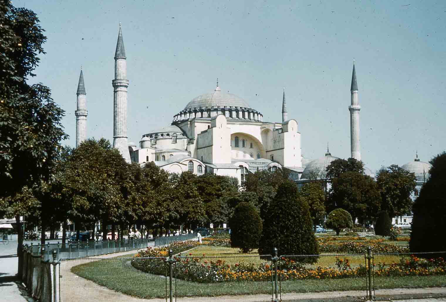 Mosquée Bleue à Istanbul avec une vue d'ensemble sur le monument, les jardins et la végétation.