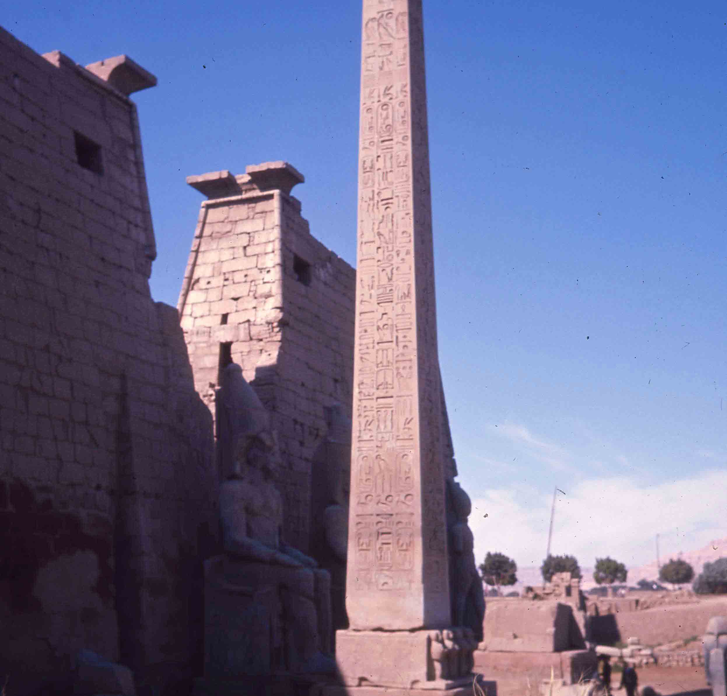 Prise de vue d'un des deux obélisques du domaine d'Amon, à Karnak. On peut observer le socle du second en arrière plan, celui-ci ayant été offert à la France. Il se trouve aujourd'hui Place de la Concorde, à Paris.