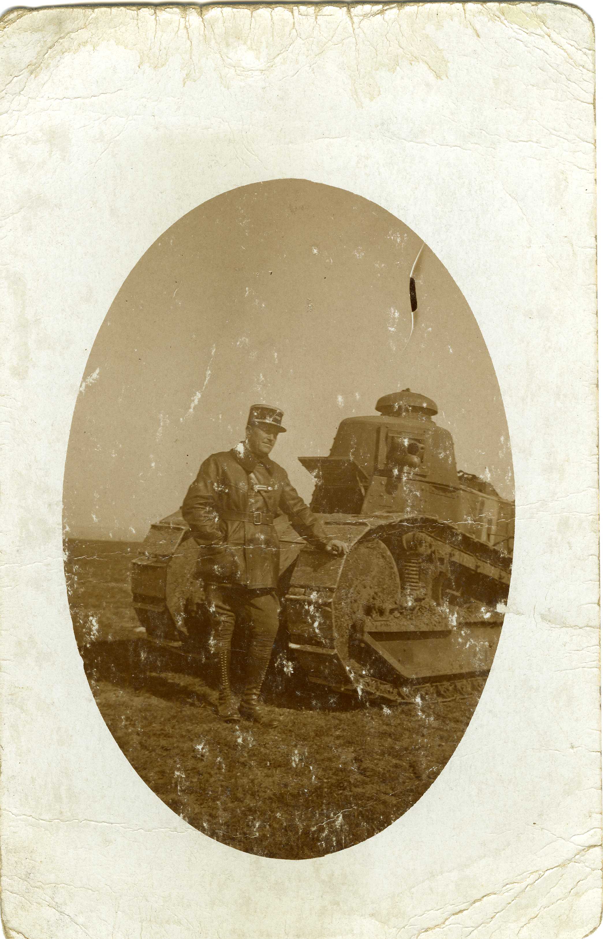 Officier français devant un char Renault FT pendant la Première Guerre mondiale.