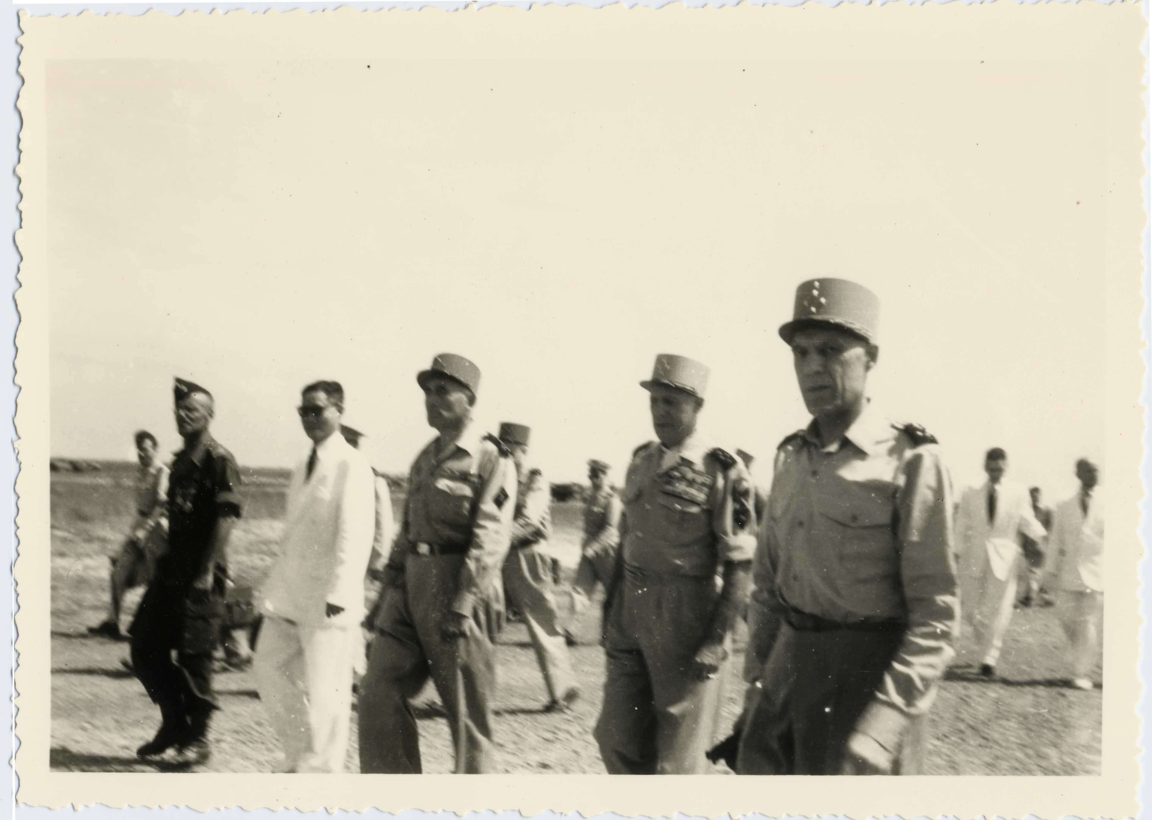 Officiers et civils dans le désert pendant la Guerre d'Indochine.