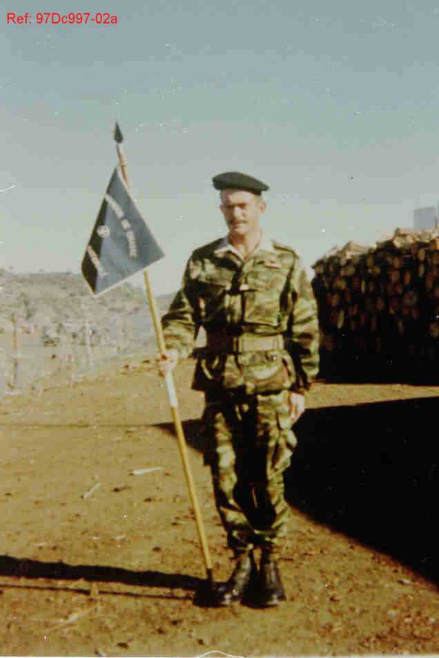 Parachutiste avec le drapeau de son régiment. La qualité de la photo ne permet pas de distinguer de quel drapeau il s'agit.