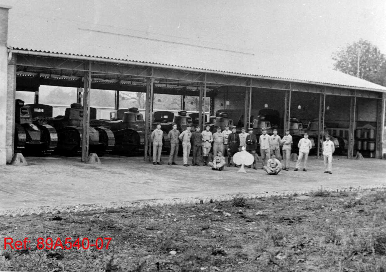 La scène semble être prise dans une caserne ou un dépôt militaire, où les équipages posent devant leur matériel dans un hangar.