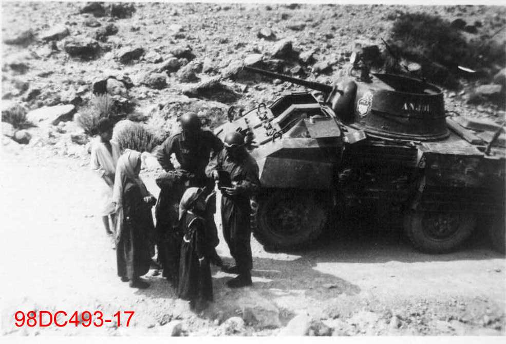 Des soldats avec des algériennes dans le désert. Ils patrouillent à bord d'une automitrailleuse AMM8.