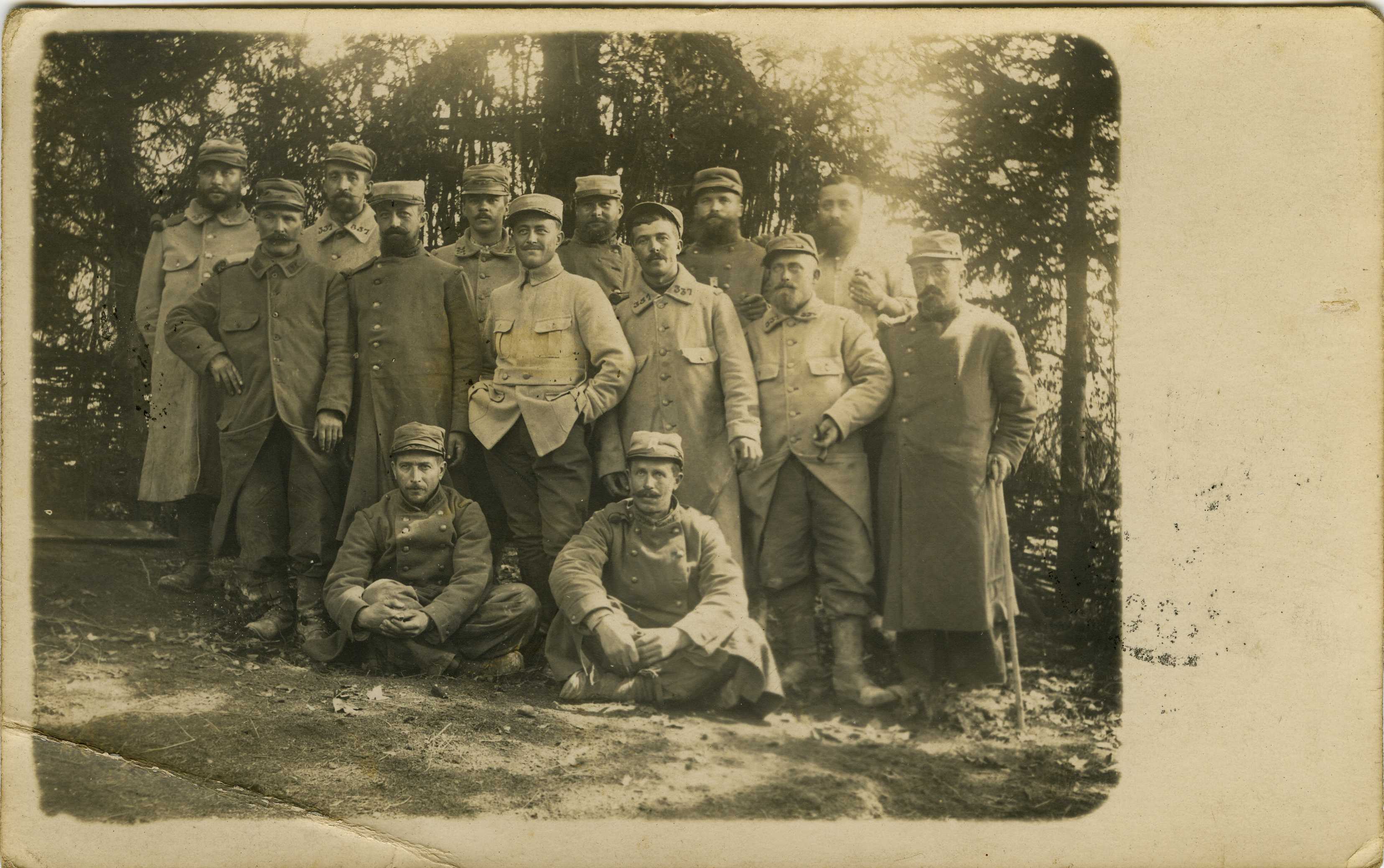 Photo collective de soldats en lisière de forêt pendant la Première Guerre mondiale