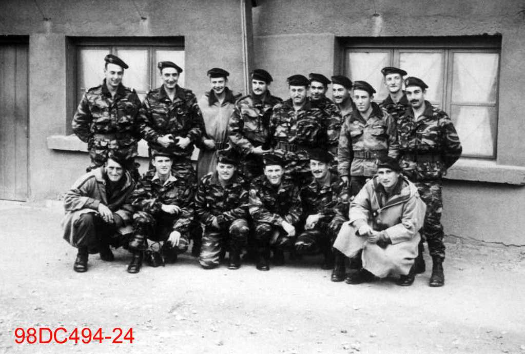 Photo de groupe de 16 militaires d’une unité française (parachutistes ? légion ?) posant devant un bâtiment. Certains sont debout, d’autres accroupis au premier rang, dans une pose typique de photo de groupe officielle ou souvenir de service.
