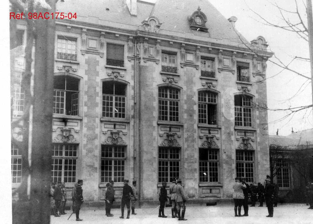 Photographie ancienne d’un bâtiment public devant lequel se trouve des militaires. L'image date très probablement de la Première guerre mondiale.