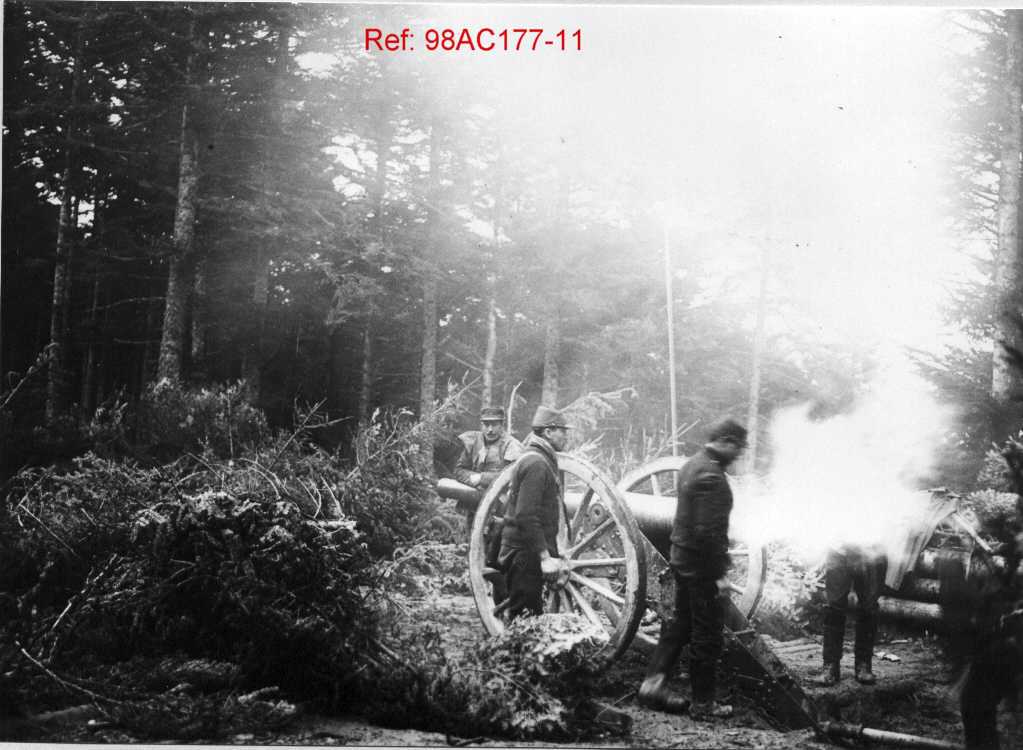 Pièce d’artillerie en forêt, un canon à roues (artillerie de campagne), plusieurs soldats sont autour de la pièce. La fumée blanche à l'arrière du canon peut faire penser qu'il vient de tirer.