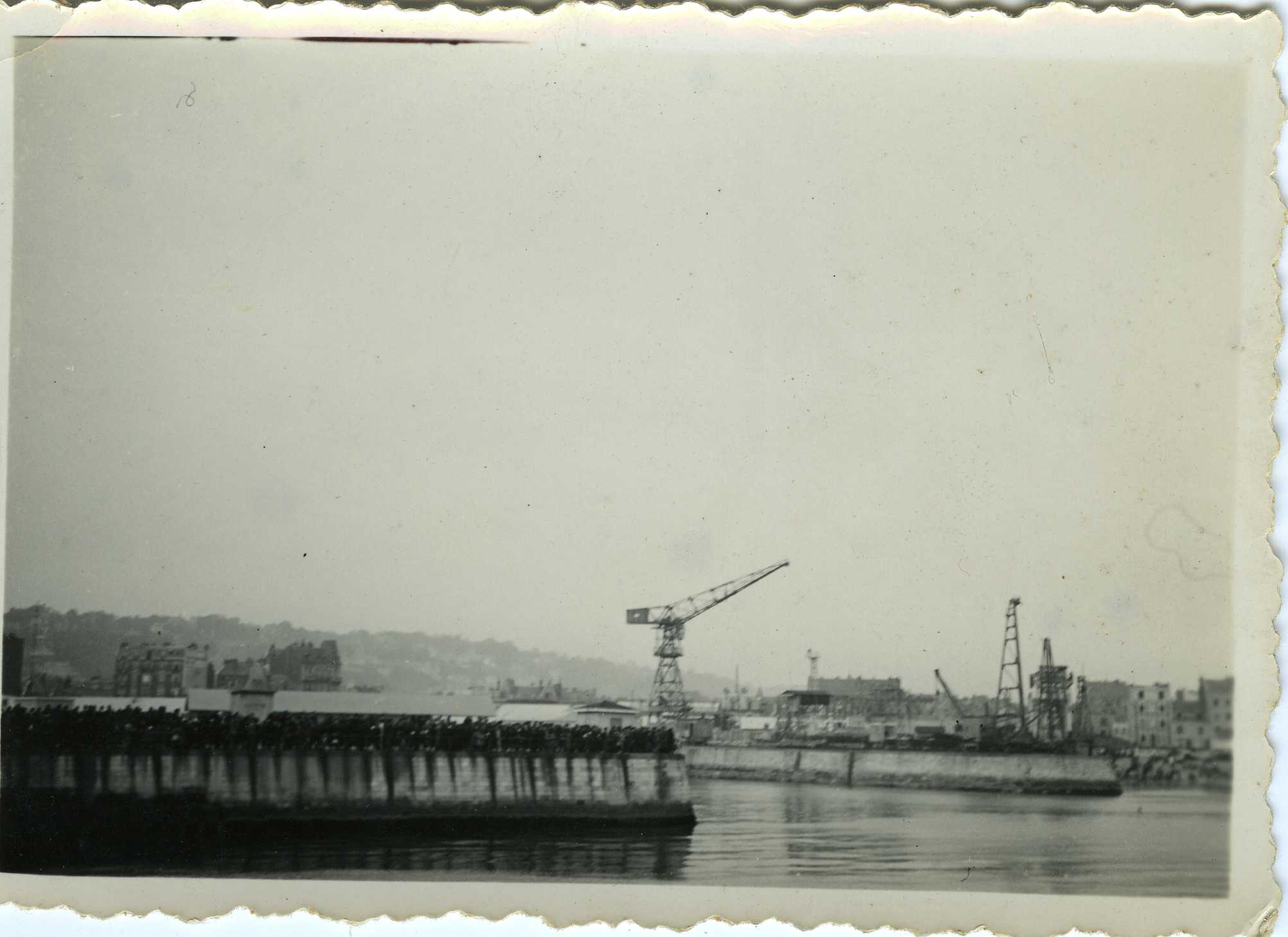 Port maritime avec une jetée, une grande grue portuaire et des chantiers ou docks en arrière-plan. À gauche, la colline urbanisée en arrière-plan pourrait correspondre à Granville (Manche) : la Haute-Ville perchée sur son promontoire rocheux dominant le port. Les grues, elles, font penser à l’activité industrielle et portuaire de l’époque (milieu XXe siècle), probablement liées aux travaux du port de commerce ou de pêche.