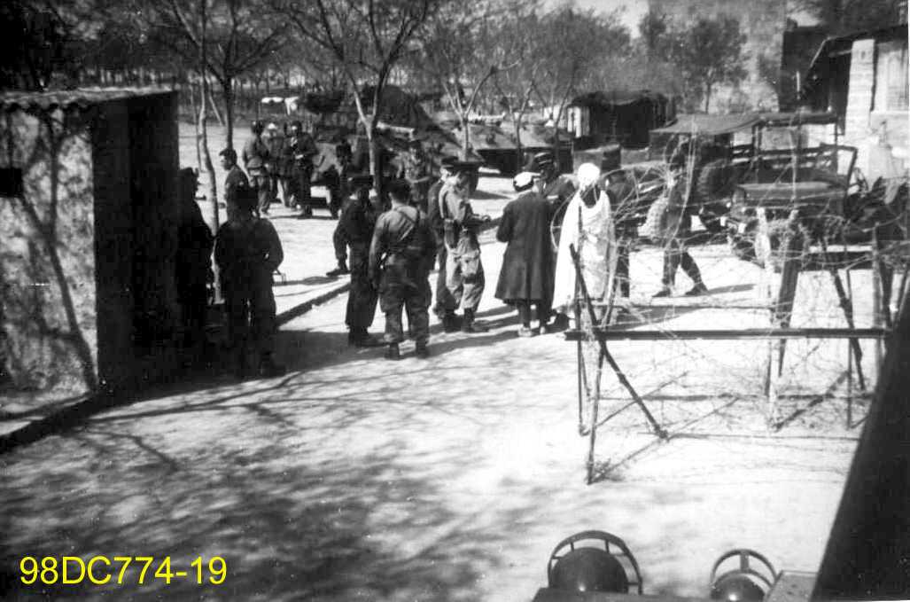 Des militaires français contrôlent des civils algériens à l'entrée d'une ville ou d'un camp. On voit des barrières avec des barbelés.