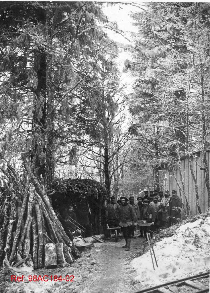 Les hommes coupent du bois dans le but de se chauffer ou de construire des tranchées. Au premier plan, on distingue des rails ce qui peut laisser supposer qu'une partie du bois était transportée dans d'autres lieux.