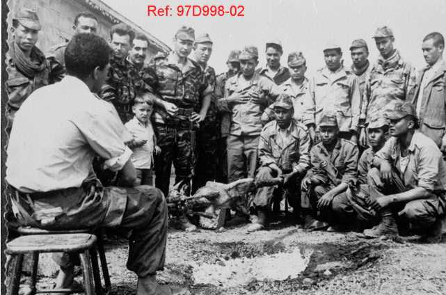 Un homme est assis sur un tabouret et s'adresse à des paras (à gauche) et des soldats locaux (en face.) La scène se situe probablement au Maghreb (Algérie ?).