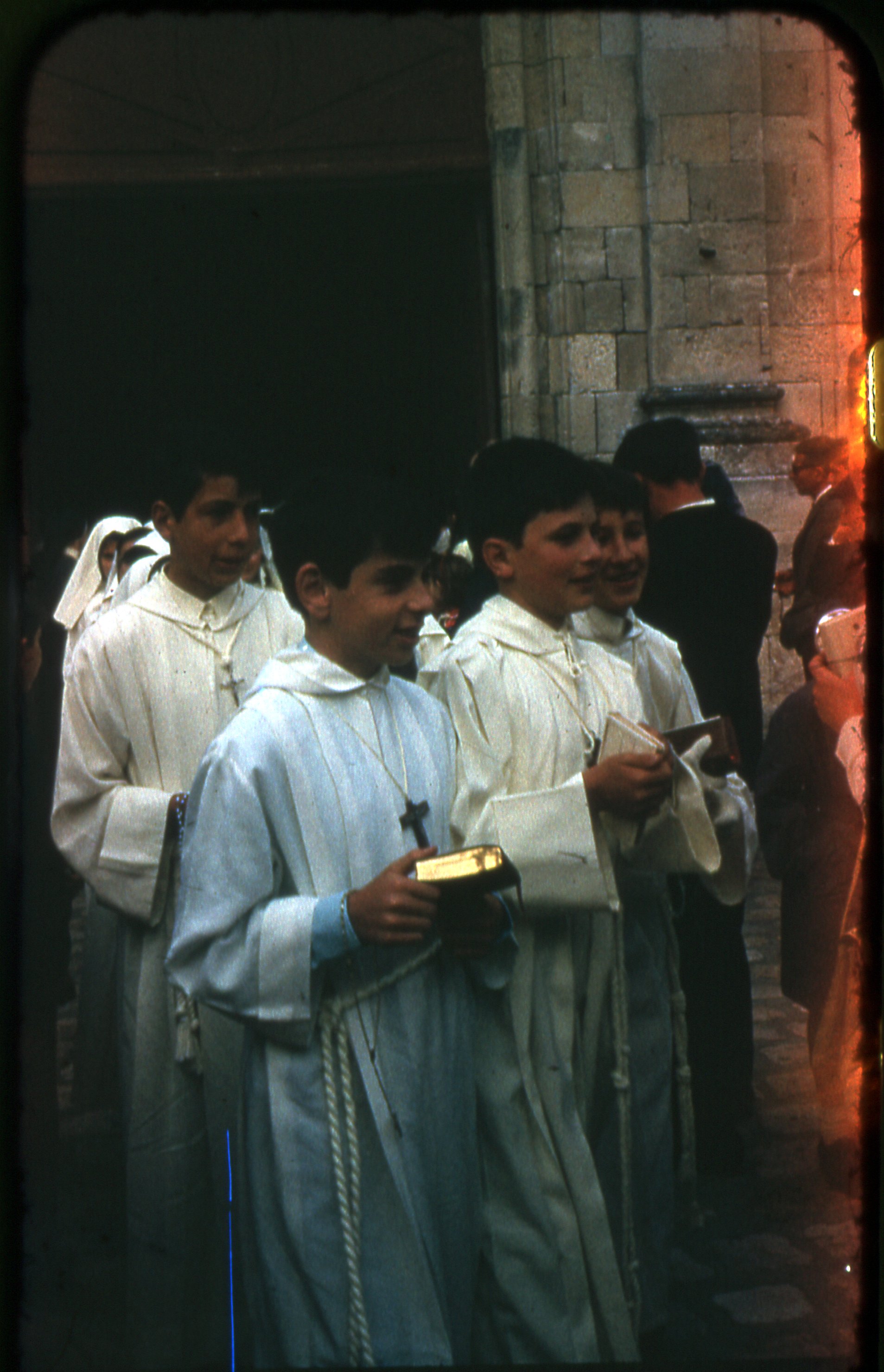 Des jeunes garçons sortent de l'église en tenue de cérémonie religieuse avec un chapelet et un livre dans la main.