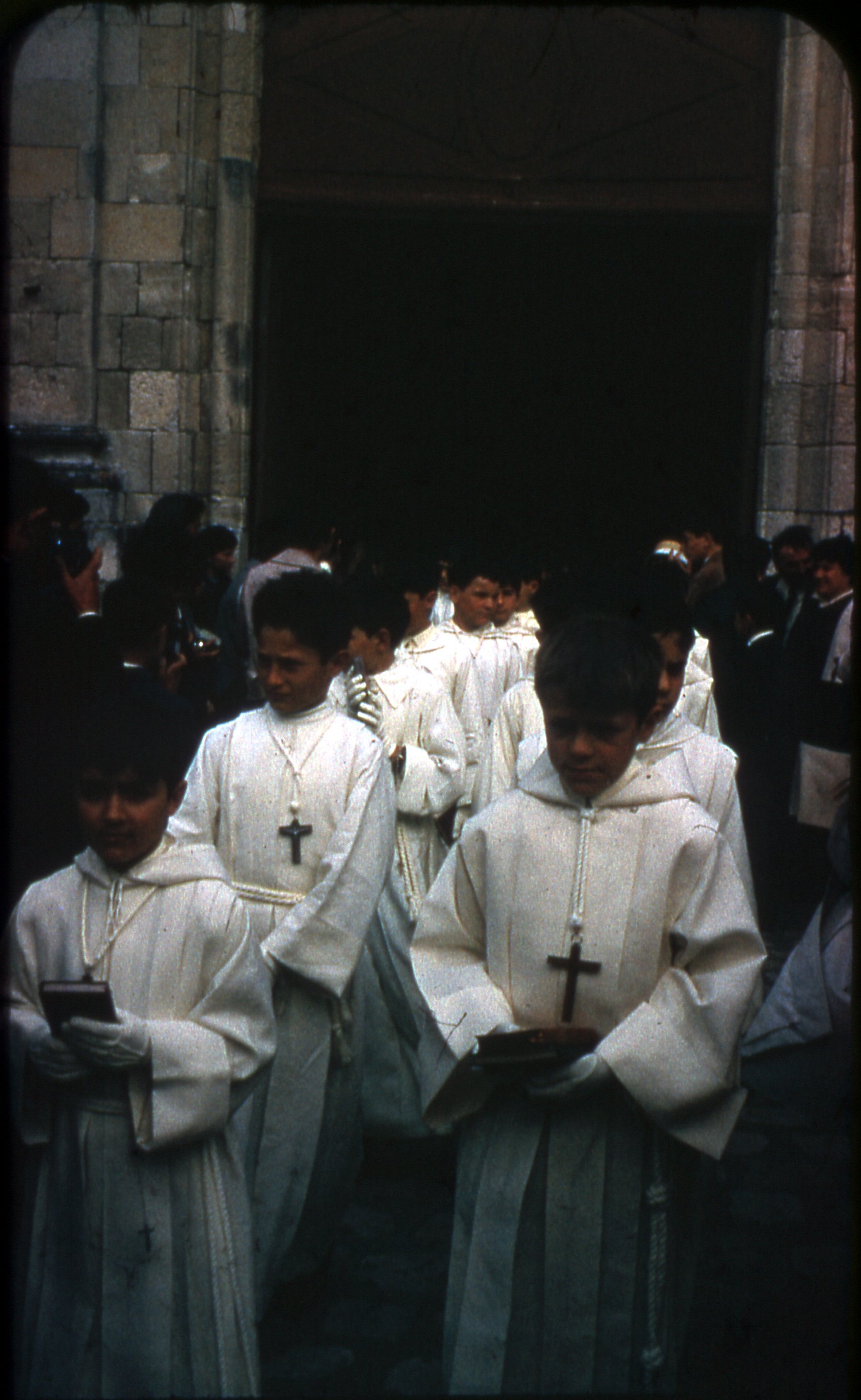 Des jeunes garçons sortent de l'église en tenue de cérémonie religieuse avec un chapelet et un livre dans la main.