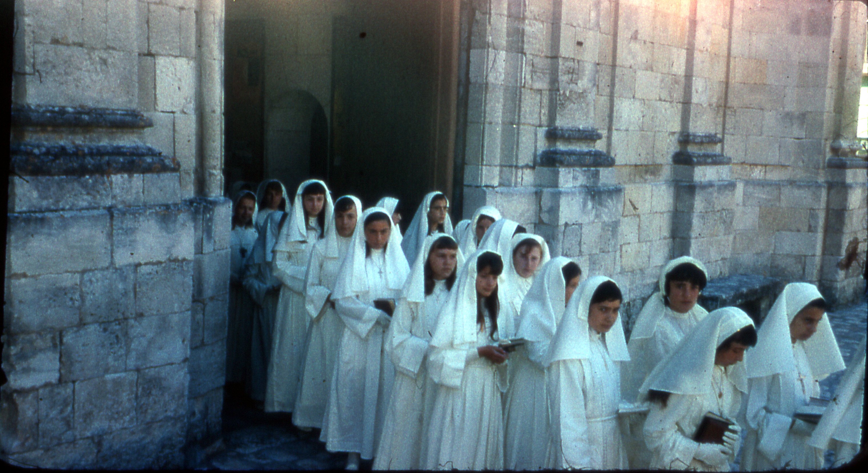 Des jeunes filles sortent de l'église en tenue de cérémonie religieuse avec un chapelet et un livre dans la main.