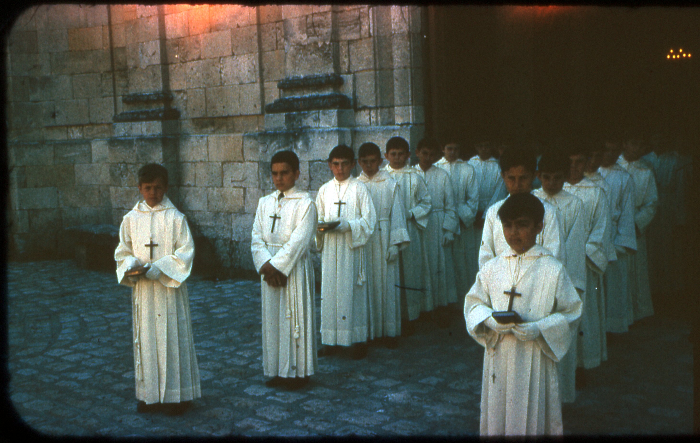 Des jeunes garçons sortent de l'église en tenue de cérémonie religieuse avec un chapelet et un livre dans la main.